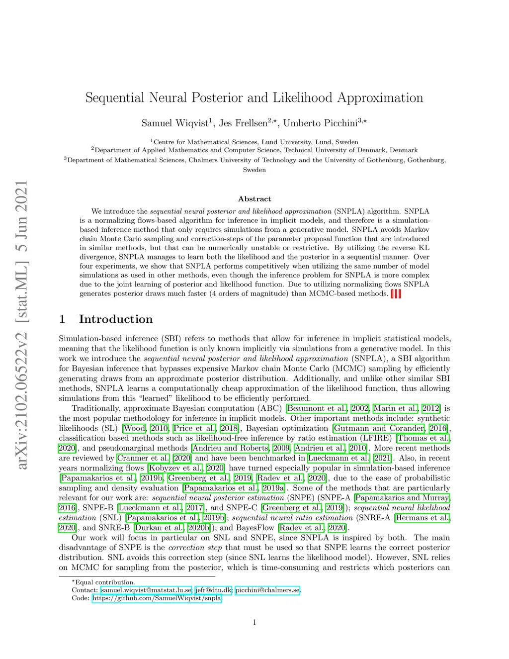 We introduce the sequential neural posterior and likelihood approximation (SNPLA) algorithm. SNPLA is a normalizing flows-based algorithm for inference in implicit models, and therefore is a simulation-based inference method that only requires simulations from a generative model. SNPLA avoids Markov chain Monte Carlo sampling and correction-steps of the parameter proposal function that are introduced in similar methods, but that can be numerically unstable or restrictive. By utilizing the reverse KL divergence, SNPLA manages to learn both the likelihood and the posterior in a sequential manner. Over four experiments, we show that SNPLA performs competitively when utilizing the same number of model simulations as used in other methods, even though the inference problem for SNPLA is more complex due to the joint learning of posterior and likelihood function. Due to utilizing normalizing flows SNPLA generates posterior draws much faster (4 orders of magnitude) than MCMC-based methods.