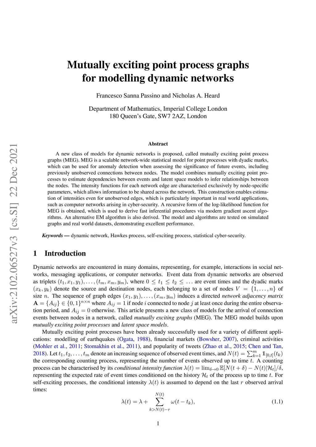 A new class of models for dynamic networks is proposed, called mutually exciting point process graphs (MEG). MEG is a scalable network-wide statistical model for point processes with dyadic marks, which can be used for anomaly detection when assessing the significance future events, including previously unobserved connections. The model combines mutually exciting point processes to estimate dependencies between events and latent space models to infer relationships between the nodes. The intensity functions for each network edge are parameterised exclusively by node-specific parameters, which allows information to be shared across the network. This construction enables estimation of intensities even for unobserved edges, which is particularly important in real world applications, such as computer networks arising in cyber-security. A recursive form of the log-likelihood is obtained, which is used to derive fast inferential procedures via modern gradient ascent algorithms. An EM algorithm is also derived. The model is tested on simulated graphs and real world datasets, demonstrating excellent performance.