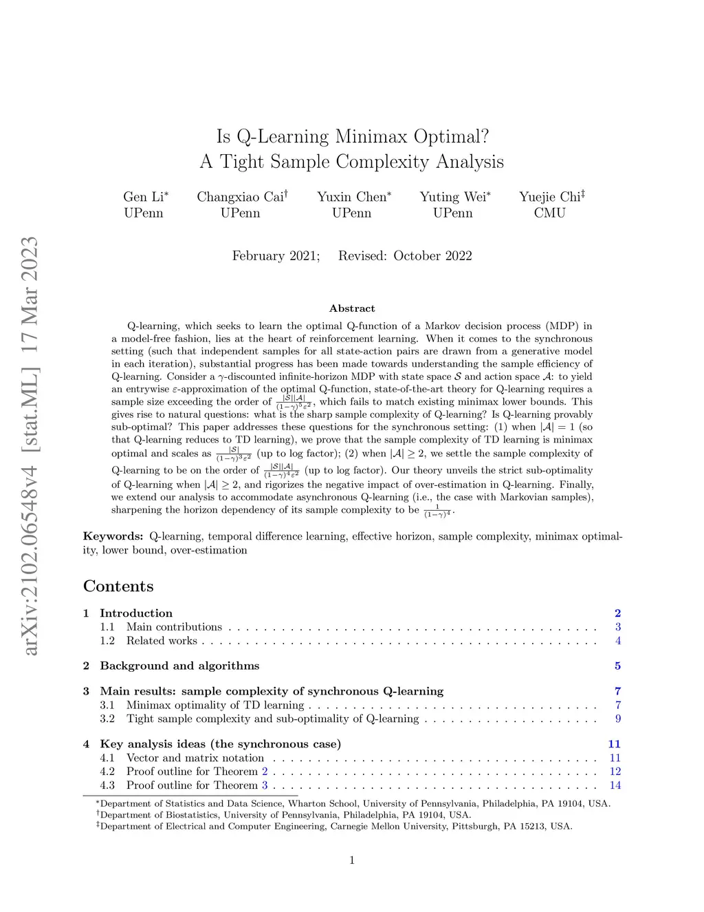 Q-learning, which seeks to learn the optimal Q-function of a Markov decision process (MDP) in a model-free fashion, lies at the heart of reinforcement learning. When it comes to the synchronous setting (such that independent samples for all state-action pairs are drawn from a generative model in each iteration), substantial progress has been made towards understanding the sample efficiency of Q-learning. Consider a -discounted infinite-horizon MDP with state space and action space : to yield an entrywise -approximation of the optimal Q-function, state-of-the-art theory for Q-learning requires a sample size exceeding the order of , which fails to match existing minimax lower bounds. This gives rise to natural questions: what is the sharp sample complexity of Q-learning? Is Q-learning provably sub-optimal? This paper addresses these questions for the synchronous setting: (1) when (so that Q-learning reduces to TD learning), we prove that the sample complexity of TD learning is minimax optimal and scales as (up to log factor); (2) when , we settle the sample complexity of Q-learning to be on the order of (up to log factor). Our theory unveils the strict sub-optimality of Q-learning when , and rigorizes the negative impact of over-estimation in Q-learning. Finally, we extend our analysis to accommodate asynchronous Q-learning (i.e., the case with Markovian samples), sharpening the horizon dependency of its sample complexity to be .