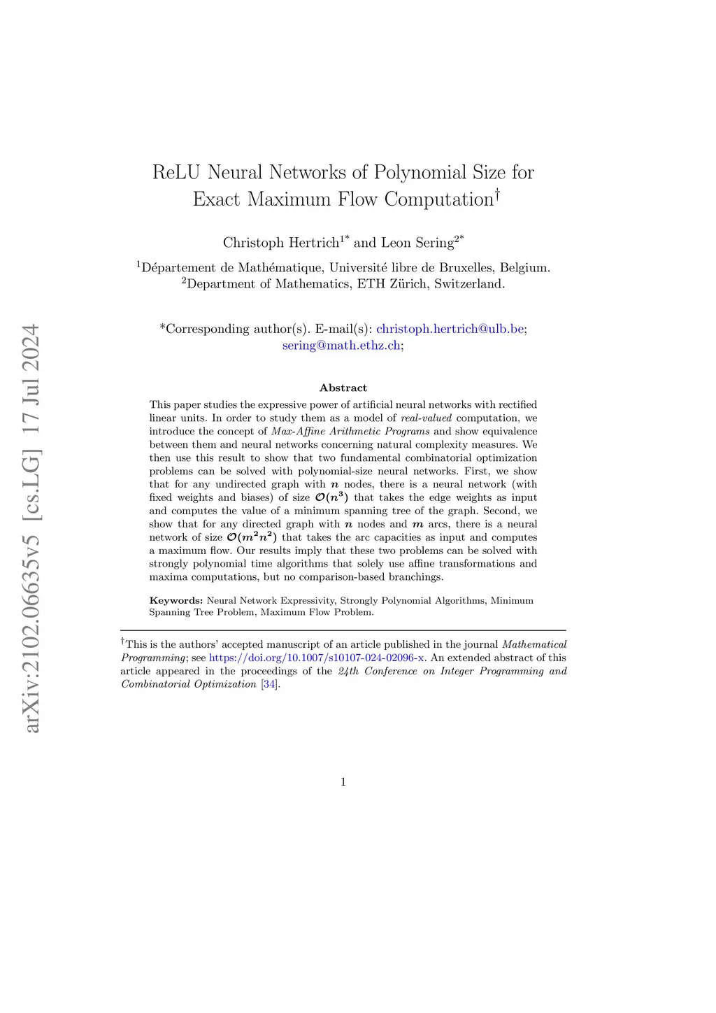 This paper studies the expressive power of artificial neural networks with rectified linear units. In order to study them as a model of real-valued computation, we introduce the concept of Max-Affine Arithmetic Programs and show equivalence between them and neural networks concerning natural complexity measures. We then use this result to show that two fundamental combinatorial optimization problems can be solved with polynomial-size neural networks. First, we show that for any undirected graph with nodes, there is a neural network (with fixed weights and biases) of size that takes the edge weights as input and computes the value of a minimum spanning tree of the graph. Second, we show that for any directed graph with nodes and arcs, there is a neural network of size that takes the arc capacities as input and computes a maximum flow. Our results imply that these two problems can be solved with strongly polynomial time algorithms that solely use affine transformations and maxima computations, but no comparison-based branchings.