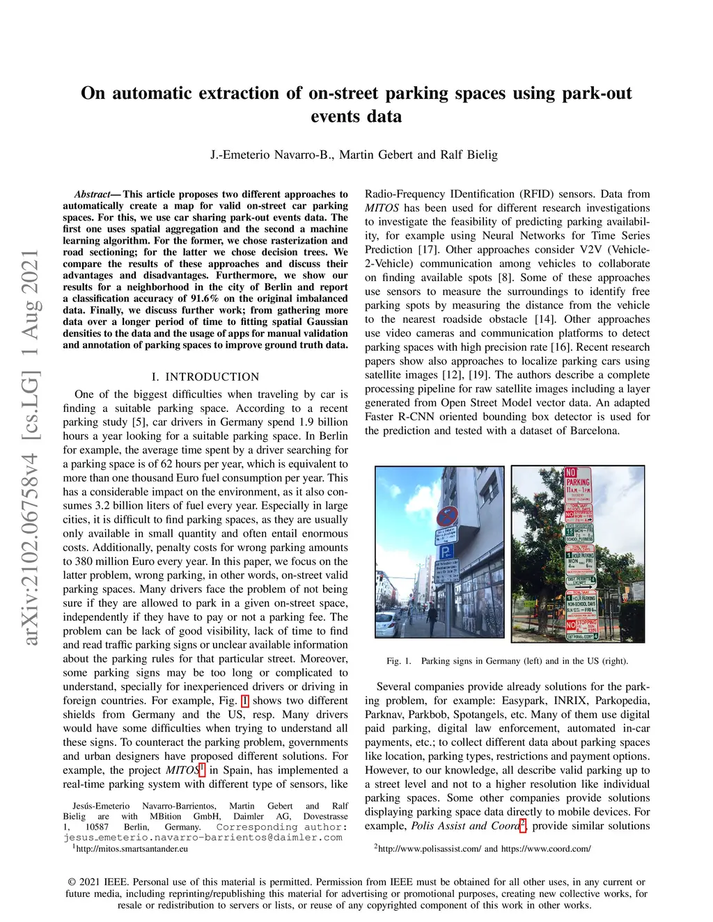 This article proposes two different approaches to automatically create a map for valid on-street car parking spaces. For this, we use car sharing park-out events data. The first one uses spatial aggregation and the second a machine learning algorithm. For the former, we chose rasterization and road sectioning; for the latter we chose decision trees. We compare the results of these approaches and discuss their advantages and disadvantages. Furthermore, we show our results for a neighborhood in the city of Berlin and report a classification accuracy of 91.6\% on the original imbalanced data. Finally, we discuss further work; from gathering more data over a longer period of time to fitting spatial Gaussian densities to the data and the usage of apps for manual validation and annotation of parking spaces to improve ground truth data.