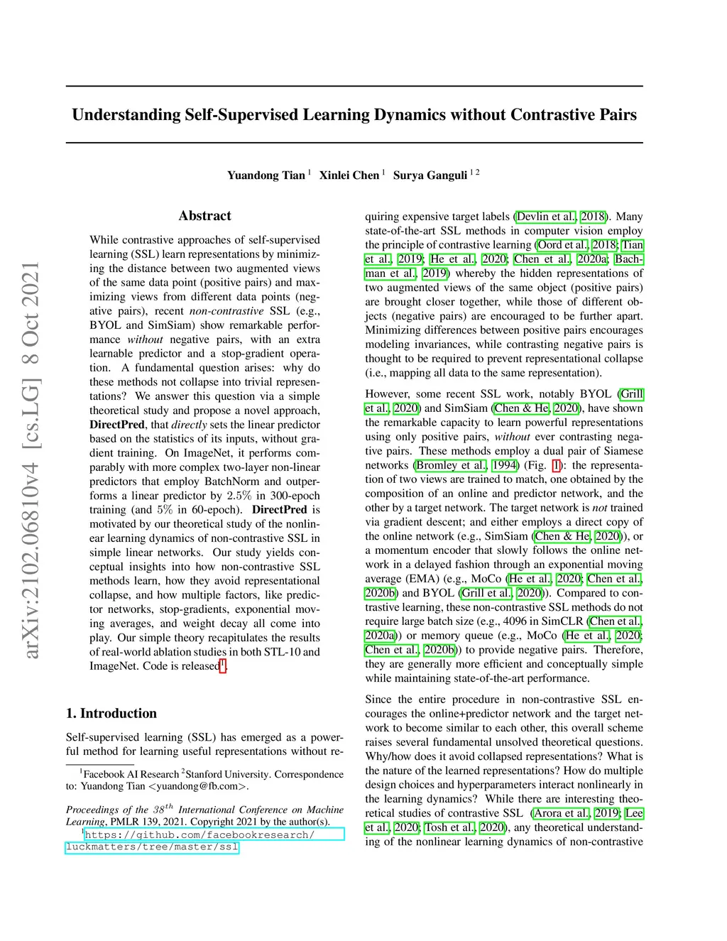 While contrastive approaches of self-supervised learning (SSL) learn representations by minimizing the distance between two augmented views of the same data point (positive pairs) and maximizing views from different data points (negative pairs), recent \emph{non-contrastive} SSL (e.g., BYOL and SimSiam) show remarkable performance {\it without} negative pairs, with an extra learnable predictor and a stop-gradient operation. A fundamental question arises: why do these methods not collapse into trivial representations? We answer this question via a simple theoretical study and propose a novel approach, DirectPred, that \emph{directly} sets the linear predictor based on the statistics of its inputs, without gradient training. On ImageNet, it performs comparably with more complex two-layer non-linear predictors that employ BatchNorm and outperforms a linear predictor by in 300-epoch training (and in 60-epoch). DirectPred is motivated by our theoretical study of the nonlinear learning dynamics of non-contrastive SSL in simple linear networks. Our study yields conceptual insights into how non-contrastive SSL methods learn, how they avoid representational collapse, and how multiple factors, like predictor networks, stop-gradients, exponential moving averages, and weight decay all come into play. Our simple theory recapitulates the results of real-world ablation studies in both STL-10 and ImageNet. Code is released https://github.com/facebookresearch/luckmatters/tree/master/ssl.