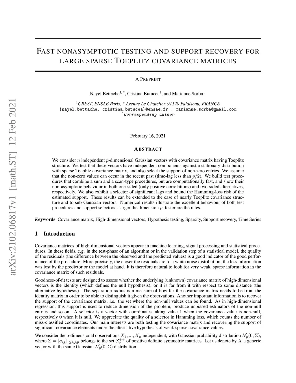 We consider independent -dimensional Gaussian vectors with covariance matrix having Toeplitz structure. We test that these vectors have independent components against a stationary distribution with sparse Toeplitz covariance matrix, and also select the support of non-zero entries. We assume that the non-zero values can occur in the recent past (time-lag less than ). We build test procedures that combine a sum and a scan-type procedures, but are computationally fast, and show their non-asymptotic behaviour in both one-sided (only positive correlations) and two-sided alternatives, respectively. We also exhibit a selector of significant lags and bound the Hamming-loss risk of the estimated support. These results can be extended to the case of nearly Toeplitz covariance structure and to sub-Gaussian vectors. Numerical results illustrate the excellent behaviour of both test procedures and support selectors - larger the dimension , faster are the rates.