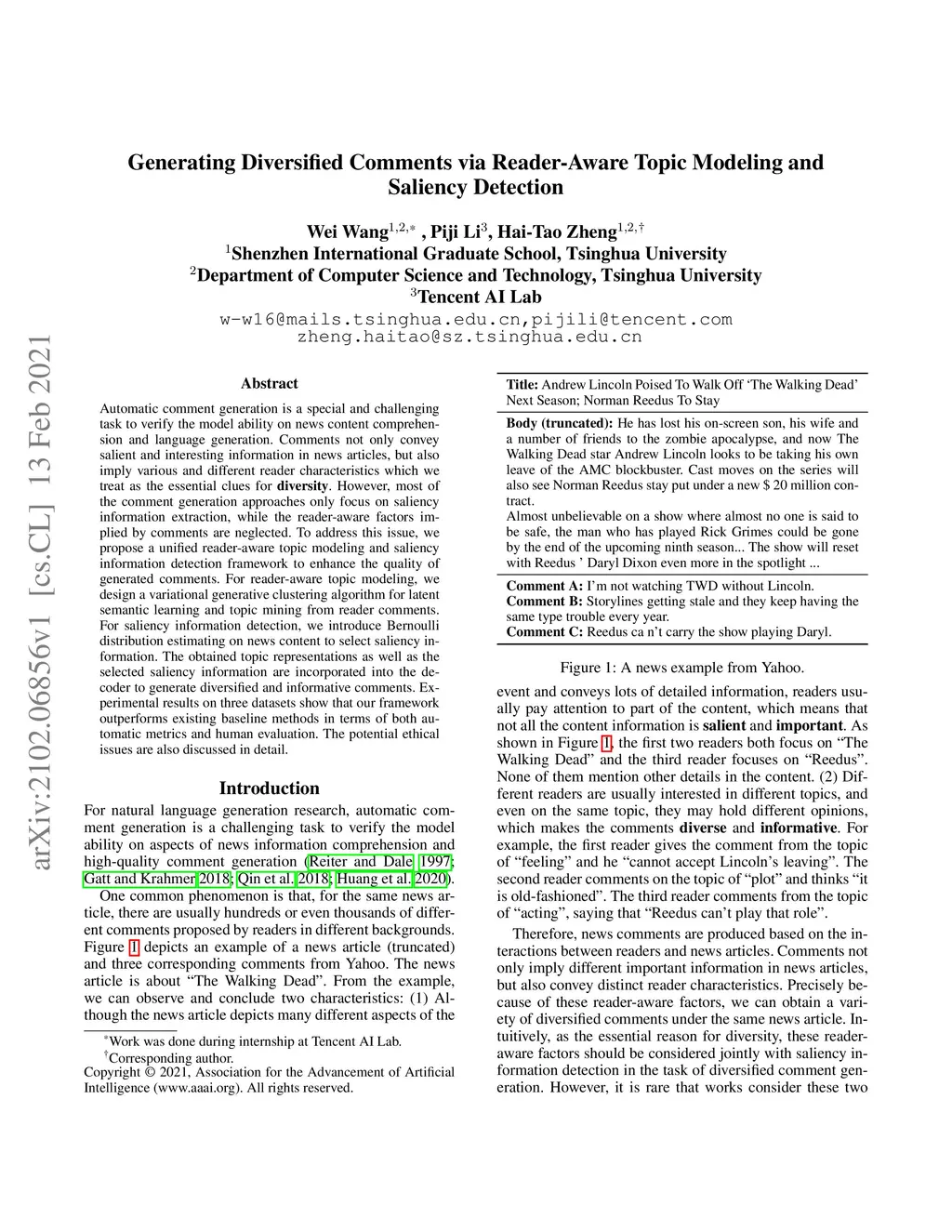 Automatic comment generation is a special and challenging task to verify the model ability on news content comprehension and language generation. Comments not only convey salient and interesting information in news articles, but also imply various and different reader characteristics which we treat as the essential clues for diversity. However, most of the comment generation approaches only focus on saliency information extraction, while the reader-aware factors implied by comments are neglected. To address this issue, we propose a unified reader-aware topic modeling and saliency information detection framework to enhance the quality of generated comments. For reader-aware topic modeling, we design a variational generative clustering algorithm for latent semantic learning and topic mining from reader comments. For saliency information detection, we introduce Bernoulli distribution estimating on news content to select saliency information. The obtained topic representations as well as the selected saliency information are incorporated into the decoder to generate diversified and informative comments. Experimental results on three datasets show that our framework outperforms existing baseline methods in terms of both automatic metrics and human evaluation. The potential ethical issues are also discussed in detail.