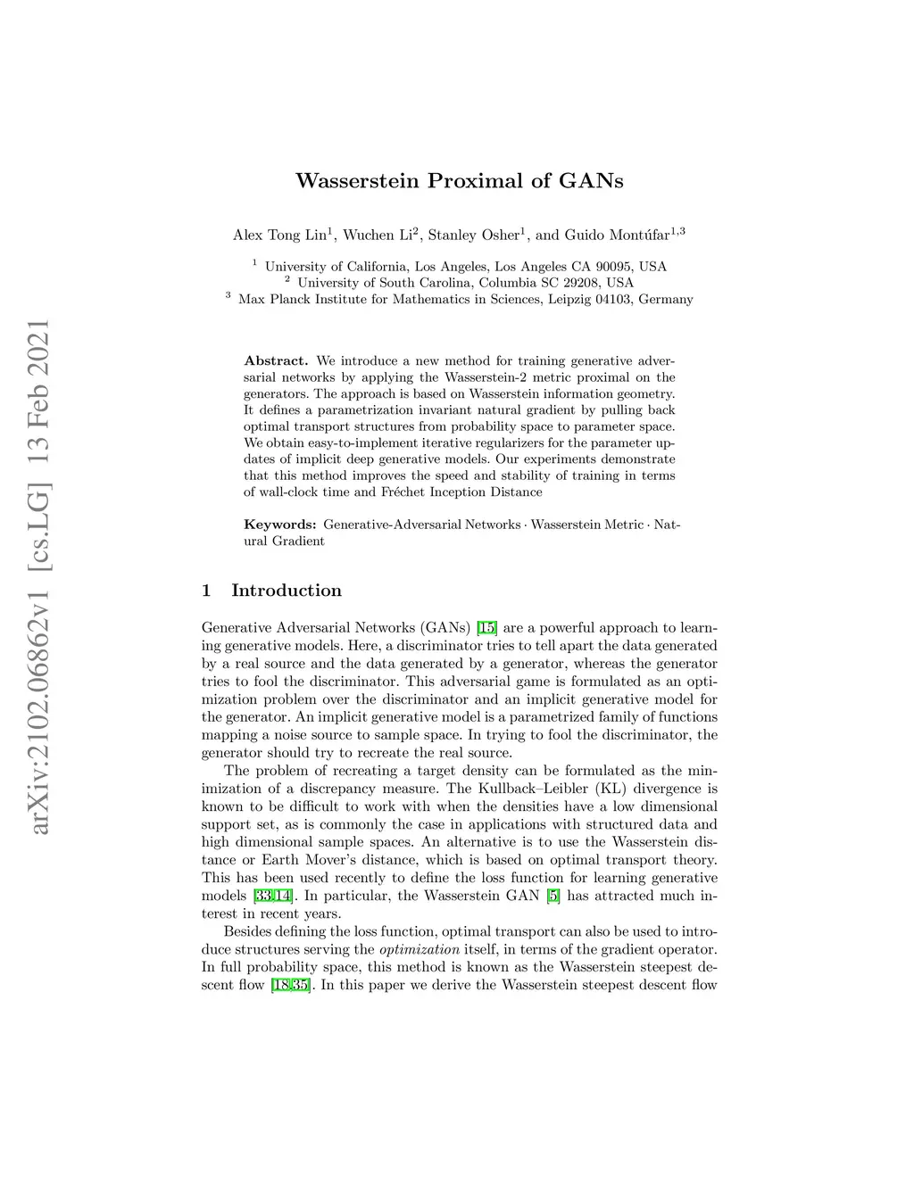 We introduce a new method for training generative adversarial networks by applying the Wasserstein-2 metric proximal on the generators. The approach is based on Wasserstein information geometry. It defines a parametrization invariant natural gradient by pulling back optimal transport structures from probability space to parameter space. We obtain easy-to-implement iterative regularizers for the parameter updates of implicit deep generative models. Our experiments demonstrate that this method improves the speed and stability of training in terms of wall-clock time and Fr\échet Inception Distance.
