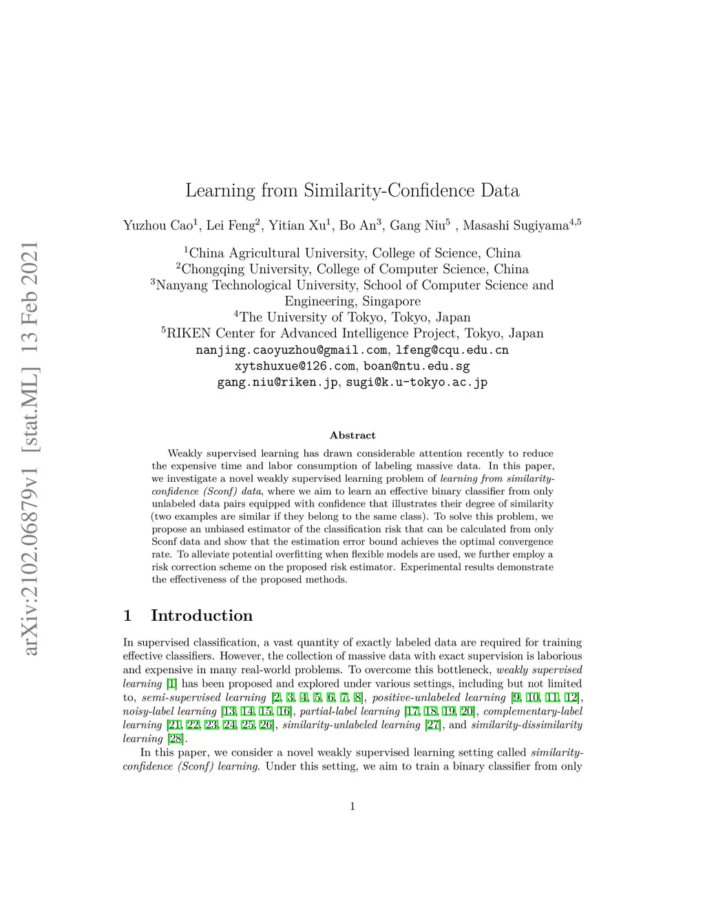 Weakly supervised learning has drawn considerable attention recently to reduce the expensive time and labor consumption of labeling massive data. In this paper, we investigate a novel weakly supervised learning problem of learning from similarity-confidence (Sconf) data, where we aim to learn an effective binary classifier from only unlabeled data pairs equipped with confidence that illustrates their degree of similarity (two examples are similar if they belong to the same class). To solve this problem, we propose an unbiased estimator of the classification risk that can be calculated from only Sconf data and show that the estimation error bound achieves the optimal convergence rate. To alleviate potential overfitting when flexible models are used, we further employ a risk correction scheme on the proposed risk estimator. Experimental results demonstrate the effectiveness of the proposed methods.