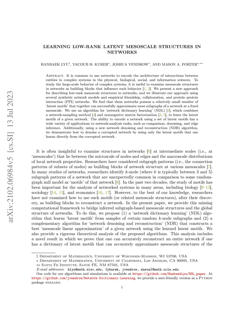 It is common to use networks to encode the architecture of interactions between entities in complex systems in the physical, biological, social, and information sciences. To study the large-scale behavior of complex systems, it is useful to examine mesoscale structures in networks as building blocks that influence such behavior. We present a new approach for describing low-rank mesoscale structures in networks, and we illustrate our approach using several synthetic network models and empirical friendship, collaboration, and protein--protein interaction (PPI) networks. We find that these networks possess a relatively small number of `latent motifs' that together can successfully approximate most subgraphs of a network at a fixed mesoscale. We use an algorithm for `network dictionary learning' (NDL), which combines a network-sampling method and nonnegative matrix factorization, to learn the latent motifs of a given network. The ability to encode a network using a set of latent motifs has a wide variety of applications to network-analysis tasks, such as comparison, denoising, and edge inference. Additionally, using a new network denoising and reconstruction (NDR) algorithm, we demonstrate how to denoise a corrupted network by using only the latent motifs that one learns directly from the corrupted network.