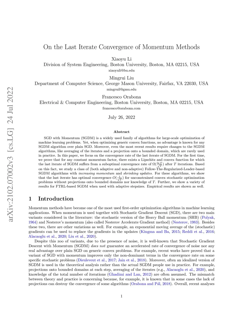 SGD with Momentum (SGDM) is a widely used family of algorithms for large-scale optimization of machine learning problems. Yet, when optimizing generic convex functions, no advantage is known for any SGDM algorithm over plain SGD. Moreover, even the most recent results require changes to the SGDM algorithms, like averaging of the iterates and a projection onto a bounded domain, which are rarely used in practice. In this paper, we focus on the convergence rate of the last iterate of SGDM. For the first time, we prove that for any constant momentum factor, there exists a Lipschitz and convex function for which the last iterate of SGDM suffers from a suboptimal convergence rate of after iterations. Based on this fact, we study a class of (both adaptive and non-adaptive) Follow-The-Regularized-Leader-based SGDM algorithms with \emph{increasing momentum} and \emph{shrinking updates}. For these algorithms, we show that the last iterate has optimal convergence for unconstrained convex stochastic optimization problems without projections onto bounded domains nor knowledge of . Further, we show a variety of results for FTRL-based SGDM when used with adaptive stepsizes. Empirical results are shown as well.