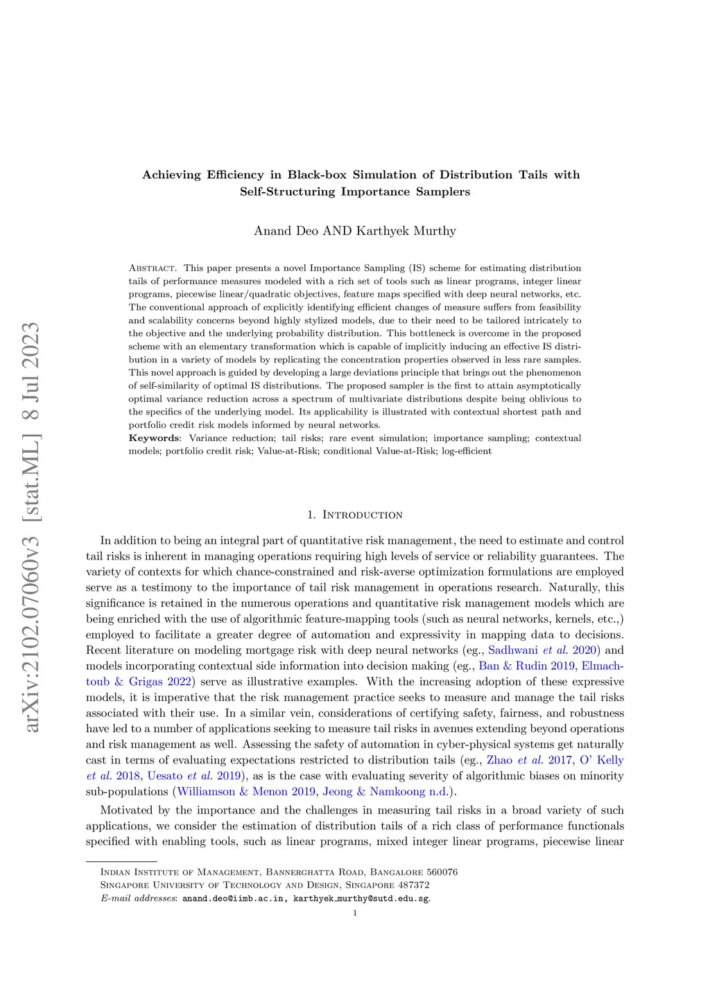 This paper presents a novel Importance Sampling (IS) scheme for estimating distribution tails of performance measures modeled with a rich set of tools such as linear programs, integer linear programs, piecewise linear/quadratic objectives, feature maps specified with deep neural networks, etc. The conventional approach of explicitly identifying efficient changes of measure suffers from feasibility and scalability concerns beyond highly stylized models, due to their need to be tailored intricately to the objective and the underlying probability distribution. This bottleneck is overcome in the proposed scheme with an elementary transformation which is capable of implicitly inducing an effective IS distribution in a variety of models by replicating the concentration properties observed in less rare samples. This novel approach is guided by developing a large deviations principle that brings out the phenomenon of self-similarity of optimal IS distributions. The proposed sampler is the first to attain asymptotically optimal variance reduction across a spectrum of multivariate distributions despite being oblivious to the specifics of the underlying model. Its applicability is illustrated with contextual shortest path and portfolio credit risk models informed by neural networks
