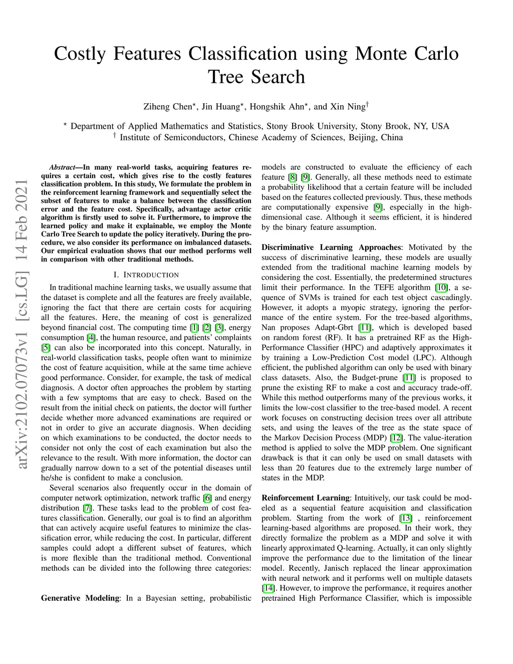 We consider the problem of costly feature classification, where we sequentially select the subset of features to make a balance between the classification error and the feature cost. In this paper, we first cast the task into a MDP problem and use Advantage Actor Critic algorithm to solve it. In order to further improve the agent's performance and make the policy explainable, we employ the Monte Carlo Tree Search to update the policy iteratively. During the procedure, we also consider its performance on the unbalanced dataset and its sensitivity to the missing value. We evaluate our model on multiple datasets and find it outperforms other methods.