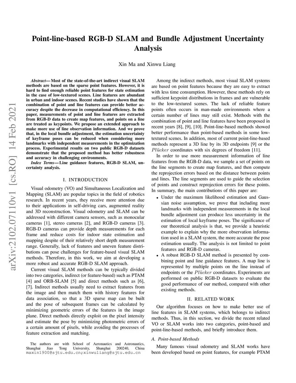 Point-line-based RGB-D SLAM and Bundle Adjustment Uncertainty Analysis