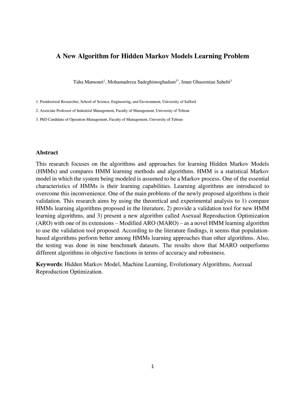 This research focuses on the algorithms and approaches for learning Hidden Markov Models (HMMs) and compares HMM learning methods and algorithms. HMM is a statistical Markov model in which the system being modeled is assumed to be a Markov process. One of the essential characteristics of HMMs is their learning capabilities. Learning algorithms are introduced to overcome this inconvenience. One of the main problems of the newly proposed algorithms is their validation. This research aims by using the theoretical and experimental analysis to 1) compare HMMs learning algorithms proposed in the literature, 2) provide a validation tool for new HMM learning algorithms, and 3) present a new algorithm called Asexual Reproduction Optimization (ARO) with one of its extensions - Modified ARO (MARO) - as a novel HMM learning algorithm to use the validation tool proposed. According to the literature findings, it seems that populationbased algorithms perform better among HMMs learning approaches than other algorithms. Also, the testing was done in nine benchmark datasets. The results show that MARO outperforms different algorithms in objective functions in terms of accuracy and robustness.