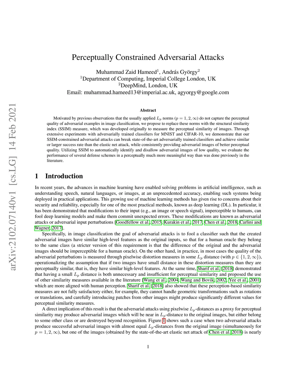 Motivated by previous observations that the usually applied norms () do not capture the perceptual quality of adversarial examples in image classification, we propose to replace these norms with the structural similarity index (SSIM) measure, which was developed originally to measure the perceptual similarity of images. Through extensive experiments with adversarially trained classifiers for MNIST and CIFAR-10, we demonstrate that our SSIM-constrained adversarial attacks can break state-of-the-art adversarially trained classifiers and achieve similar or larger success rate than the elastic net attack, while consistently providing adversarial images of better perceptual quality. Utilizing SSIM to automatically identify and disallow adversarial images of low quality, we evaluate the performance of several defense schemes in a perceptually much more meaningful way than was done previously in the literature.