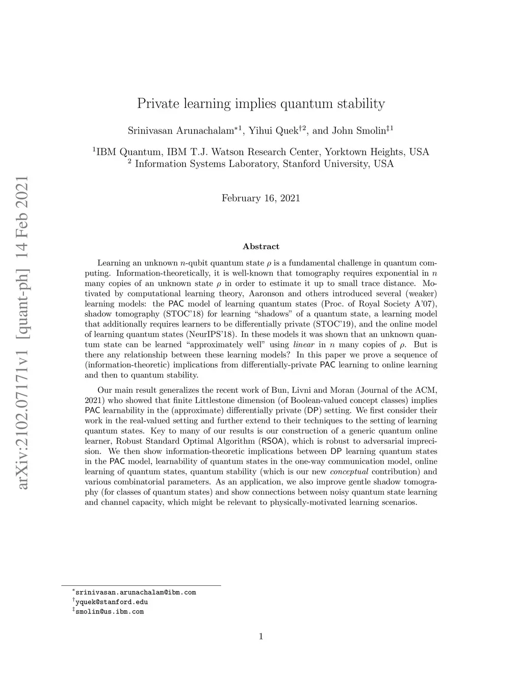 Private learning implies quantum stability