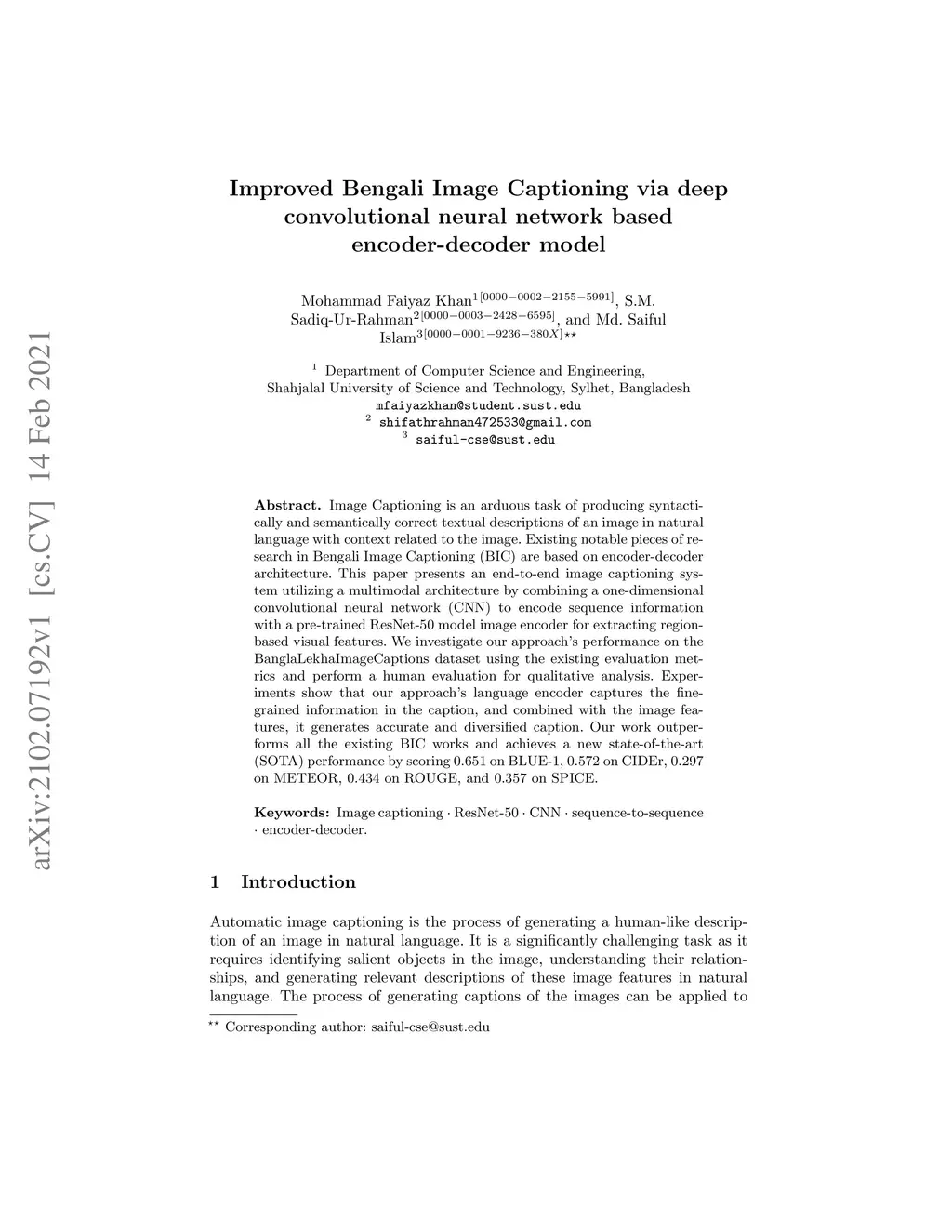 Image Captioning is an arduous task of producing syntactically and semantically correct textual descriptions of an image in natural language with context related to the image. Existing notable pieces of research in Bengali Image Captioning (BIC) are based on encoder-decoder architecture. This paper presents an end-to-end image captioning system utilizing a multimodal architecture by combining a one-dimensional convolutional neural network (CNN) to encode sequence information with a pre-trained ResNet-50 model image encoder for extracting region-based visual features. We investigate our approach's performance on the BanglaLekhaImageCaptions dataset using the existing evaluation metrics and perform a human evaluation for qualitative analysis. Experiments show that our approach's language encoder captures the fine-grained information in the caption, and combined with the image features, it generates accurate and diversified caption. Our work outperforms all the existing BIC works and achieves a new state-of-the-art (SOTA) performance by scoring 0.651 on BLUE-1, 0.572 on CIDEr, 0.297 on METEOR, 0.434 on ROUGE, and 0.357 on SPICE.