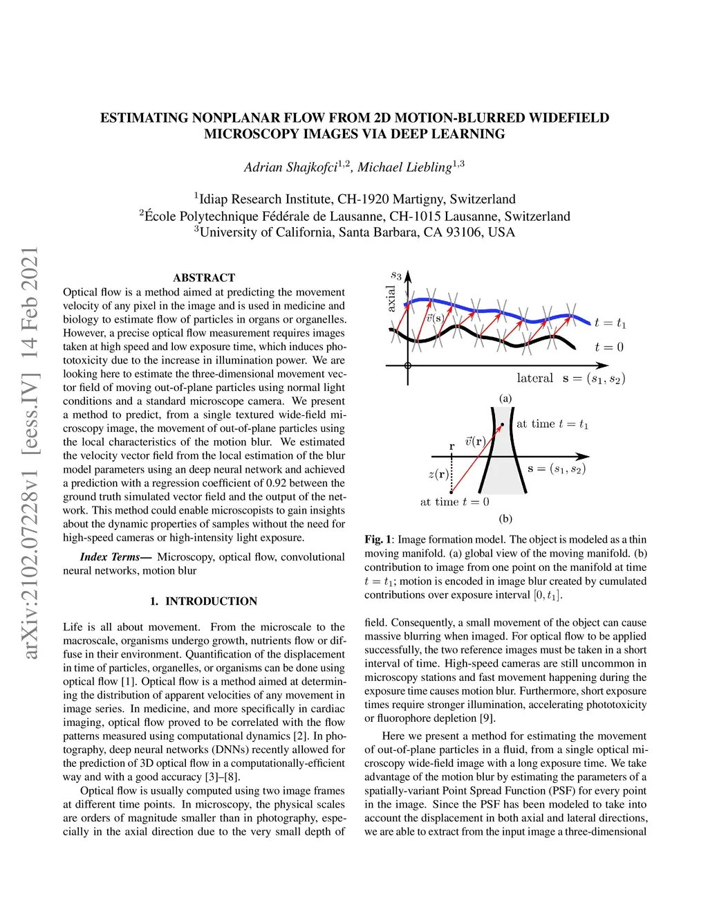 Optical flow is a method aimed at predicting the movement velocity of any pixel in the image and is used in medicine and biology to estimate flow of particles in organs or organelles. However, a precise optical flow measurement requires images taken at high speed and low exposure time, which induces phototoxicity due to the increase in illumination power. We are looking here to estimate the three-dimensional movement vector field of moving out-of-plane particles using normal light conditions and a standard microscope camera. We present a method to predict, from a single textured wide-field microscopy image, the movement of out-of-plane particles using the local characteristics of the motion blur. We estimated the velocity vector field from the local estimation of the blur model parameters using an deep neural network and achieved a prediction with a regression coefficient of 0.92 between the ground truth simulated vector field and the output of the network. This method could enable microscopists to gain insights about the dynamic properties of samples without the need for high-speed cameras or high-intensity light exposure.