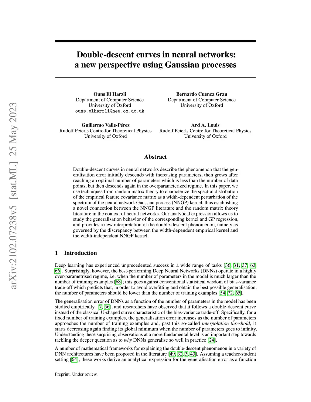 Double-descent curves in neural networks describe the phenomenon that the generalisation error initially descends with increasing parameters, then grows after reaching an optimal number of parameters which is less than the number of data points, but then descends again in the overparameterized regime. In this paper, we use techniques from random matrix theory to characterize the spectral distribution of the empirical feature covariance matrix as a width-dependent perturbation of the spectrum of the neural network Gaussian process (NNGP) kernel, thus establishing a novel connection between the NNGP literature and the random matrix theory literature in the context of neural networks. Our analytical expression allows us to study the generalisation behavior of the corresponding kernel and GP regression, and provides a new interpretation of the double-descent phenomenon, namely as governed by the discrepancy between the width-dependent empirical kernel and the width-independent NNGP kernel.