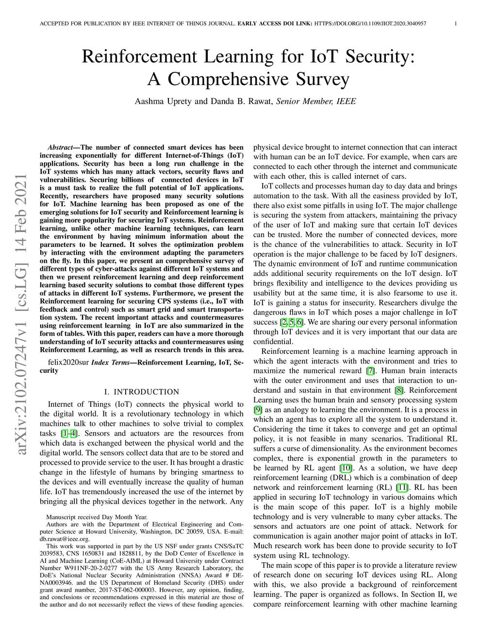 The number of connected smart devices has been increasing exponentially for different Internet-of-Things (IoT) applications. Security has been a long run challenge in the IoT systems which has many attack vectors, security flaws and vulnerabilities. Securing billions of B connected devices in IoT is a must task to realize the full potential of IoT applications. Recently, researchers have proposed many security solutions for IoT. Machine learning has been proposed as one of the emerging solutions for IoT security and Reinforcement learning is gaining more popularity for securing IoT systems. Reinforcement learning, unlike other machine learning techniques, can learn the environment by having minimum information about the parameters to be learned. It solves the optimization problem by interacting with the environment adapting the parameters on the fly. In this paper, we present an comprehensive survey of different types of cyber-attacks against different IoT systems and then we present reinforcement learning and deep reinforcement learning based security solutions to combat those different types of attacks in different IoT systems. Furthermore, we present the Reinforcement learning for securing CPS systems (i.e., IoT with feedback and control) such as smart grid and smart transportation system. The recent important attacks and countermeasures using reinforcement learning B in IoT are also summarized in the form of tables. With this paper, readers can have a more thorough understanding of IoT security attacks and countermeasures using Reinforcement Learning, as well as research trends in this area.