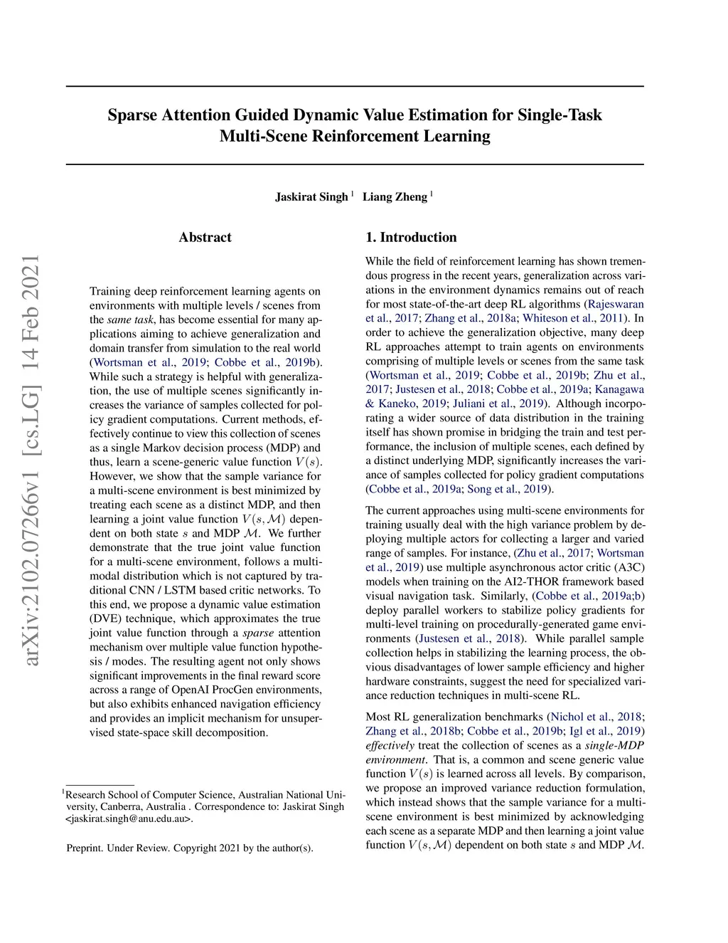 Training deep reinforcement learning agents on environments with multiple levels / scenes from the same task, has become essential for many applications aiming to achieve generalization and domain transfer from simulation to the real world. While such a strategy is helpful with generalization, the use of multiple scenes significantly increases the variance of samples collected for policy gradient computations. Current methods, effectively continue to view this collection of scenes as a single Markov decision process (MDP), and thus learn a scene-generic value function V(s). However, we argue that the sample variance for a multi-scene environment is best minimized by treating each scene as a distinct MDP, and then learning a joint value function V(s,M) dependent on both state s and MDP M. We further demonstrate that the true joint value function for a multi-scene environment, follows a multi-modal distribution which is not captured by traditional CNN / LSTM based critic networks. To this end, we propose a dynamic value estimation (DVE) technique, which approximates the true joint value function through a sparse attention mechanism over multiple value function hypothesis / modes. The resulting agent not only shows significant improvements in the final reward score across a range of OpenAI ProcGen environments, but also exhibits enhanced navigation efficiency and provides an implicit mechanism for unsupervised state-space skill decomposition.
