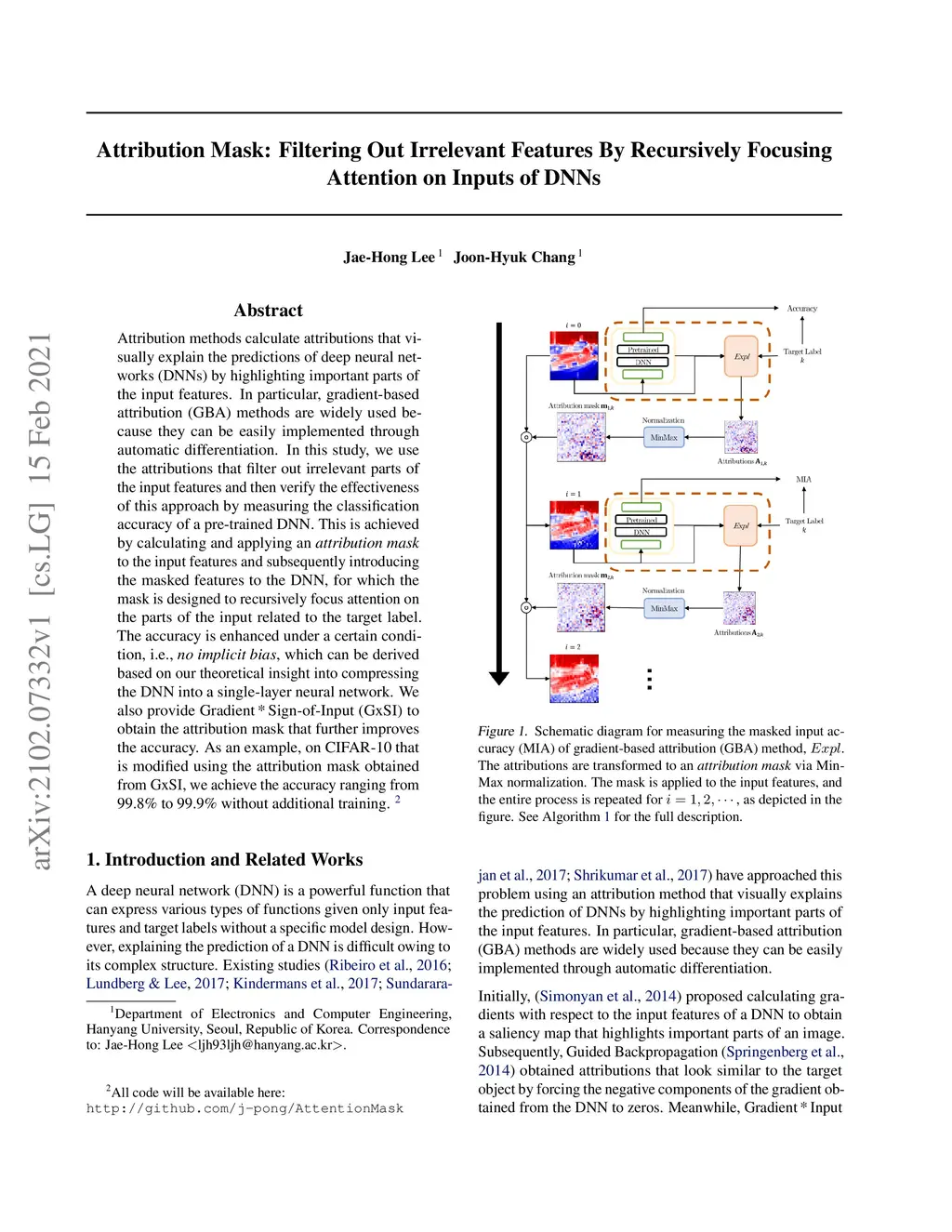 Attribution methods calculate attributions that visually explain the predictions of deep neural networks (DNNs) by highlighting important parts of the input features. In particular, gradient-based attribution (GBA) methods are widely used because they can be easily implemented through automatic differentiation. In this study, we use the attributions that filter out irrelevant parts of the input features and then verify the effectiveness of this approach by measuring the classification accuracy of a pre-trained DNN. This is achieved by calculating and applying an \textit{attribution mask} to the input features and subsequently introducing the masked features to the DNN, for which the mask is designed to recursively focus attention on the parts of the input related to the target label. The accuracy is enhanced under a certain condition, i.e., \textit{no implicit bias}, which can be derived based on our theoretical insight into compressing the DNN into a single-layer neural network. We also provide Gradient\,*\,Sign-of-Input (GxSI) to obtain the attribution mask that further improves the accuracy. As an example, on CIFAR-10 that is modified using the attribution mask obtained from GxSI, we achieve the accuracy ranging from 99.8\% to 99.9\% without additional training.