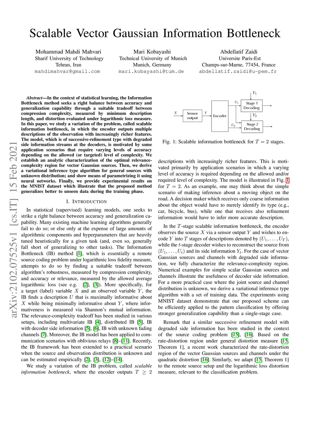 In the context of statistical learning, the Information Bottleneck method seeks a right balance between accuracy and generalization capability through a suitable tradeoff between compression complexity, measured by minimum description length, and distortion evaluated under logarithmic loss measure. In this paper, we study a variation of the problem, called scalable information bottleneck, in which the encoder outputs multiple descriptions of the observation with increasingly richer features. The model, which is of successive-refinement type with degraded side information streams at the decoders, is motivated by some application scenarios that require varying levels of accuracy depending on the allowed (or targeted) level of complexity. We establish an analytic characterization of the optimal relevance-complexity region for vector Gaussian sources. Then, we derive a variational inference type algorithm for general sources with unknown distribution; and show means of parametrizing it using neural networks. Finally, we provide experimental results on the MNIST dataset which illustrate that the proposed method generalizes better to unseen data during the training phase.