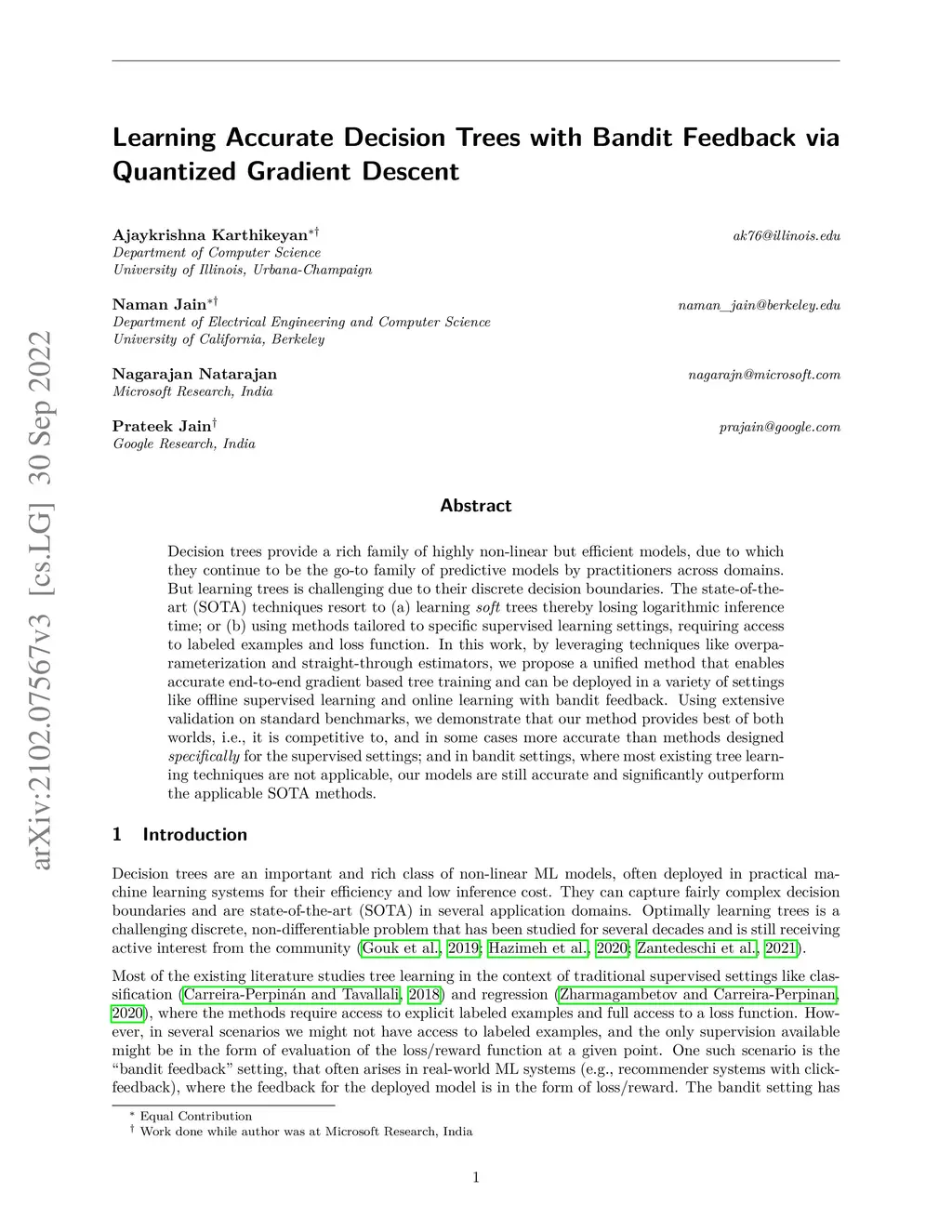 Decision trees provide a rich family of highly non-linear but efficient models, due to which they continue to be the go-to family of predictive models by practitioners across domains. But learning trees is challenging due to their discrete decision boundaries. The state-of-the-art (SOTA) techniques resort to (a) learning \textit{soft} trees thereby losing logarithmic inference time; or (b) using methods tailored to specific supervised learning settings, requiring access to labeled examples and loss function. In this work, by leveraging techniques like overparameterization and straight-through estimators, we propose a unified method that enables accurate end-to-end gradient based tree training and can be deployed in a variety of settings like offline supervised learning and online learning with bandit feedback. Using extensive validation on standard benchmarks, we demonstrate that our method provides best of both worlds, i.e., it is competitive to, and in some cases more accurate than methods designed \textit{specifically} for the supervised settings; and in bandit settings, where most existing tree learning techniques are not applicable, our models are still accurate and significantly outperform the applicable SOTA methods.