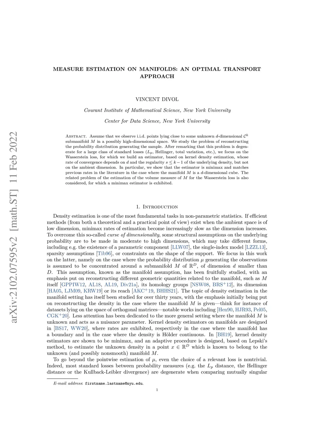 Assume that we observe i.i.d. points lying close to some unknown -dimensional submanifold in a possibly high-dimensional space. We study the problem of reconstructing the probability distribution generating the sample. After remarking that this problem is degenerate for a large class of standard losses (, Hellinger, total variation, etc.), we focus on the Wasserstein loss, for which we build an estimator, based on kernel density estimation, whose rate of convergence depends on and the regularity of the underlying density, but not on the ambient dimension. In particular, we show that the estimator is minimax and matches previous rates in the literature in the case where the manifold is a -dimensional cube. The related problem of the estimation of the volume measure of for the Wasserstein loss is also considered, for which a minimax estimator is exhibited.