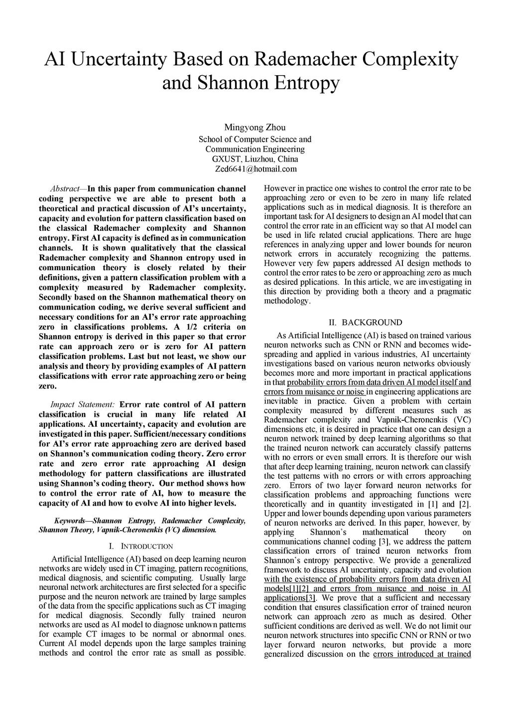 In this paper from communication channel coding perspective we are able to present both a theoretical and practical discussion of AI's uncertainty, capacity and evolution for pattern classification based on the classical Rademacher complexity and Shannon entropy. First AI capacity is defined as in communication channels. It is shown qualitatively that the classical Rademacher complexity and Shannon entropy used in communication theory is closely related by their definitions, given a pattern classification problem with a complexity measured by Rademacher complexity. Secondly based on the Shannon mathematical theory on communication coding, we derive several sufficient and necessary conditions for an AI's error rate approaching zero in classifications problems. A 1/2 criteria on Shannon entropy is derived in this paper so that error rate can approach zero or is zero for AI pattern classification problems. Last but not least, we show our analysis and theory by providing examples of AI pattern classifications with error rate approaching zero or being zero.
