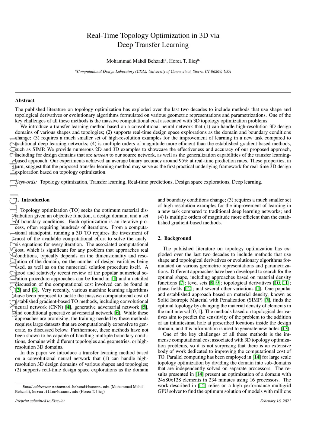 The published literature on topology optimization has exploded over the last two decades to include methods that use shape and topological derivatives or evolutionary algorithms formulated on various geometric representations and parametrizations. One of the key challenges of all these methods is the massive computational cost associated with 3D topology optimization problems. We introduce a transfer learning method based on a convolutional neural network that (1) can handle high-resolution 3D design domains of various shapes and topologies; (2) supports real-time design space explorations as the domain and boundary conditions change; (3) requires a much smaller set of high-resolution examples for the improvement of learning in a new task compared to traditional deep learning networks; (4) is multiple orders of magnitude more efficient than the established gradient-based methods, such as SIMP. We provide numerous 2D and 3D examples to showcase the effectiveness and accuracy of our proposed approach, including for design domains that are unseen to our source network, as well as the generalization capabilities of the transfer learning-based approach. Our experiments achieved an average binary accuracy of around 95% at real-time prediction rates. These properties, in turn, suggest that the proposed transfer-learning method may serve as the first practical underlying framework for real-time 3D design exploration based on topology optimization