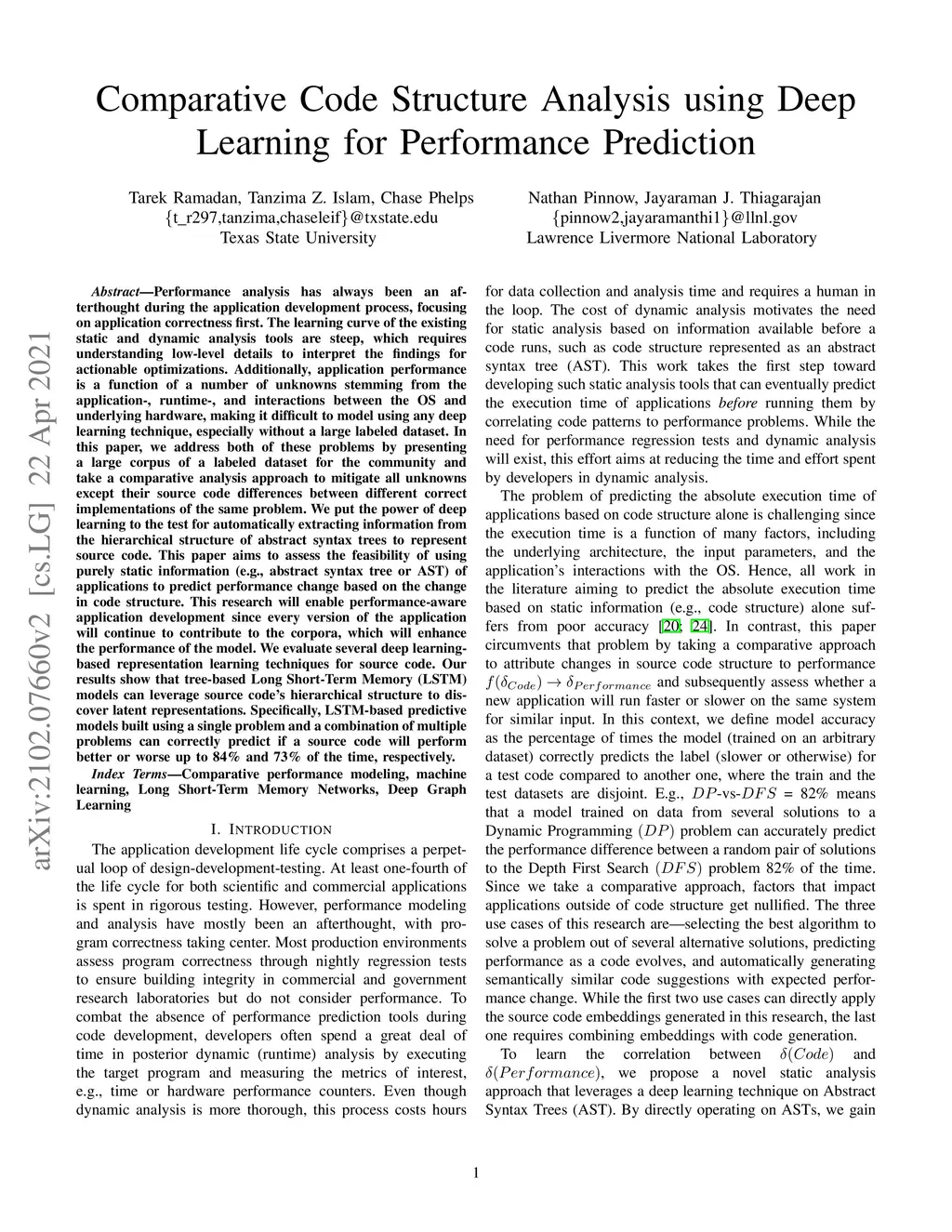 Performance analysis has always been an afterthought during the application development process, focusing on application correctness first. The learning curve of the existing static and dynamic analysis tools are steep, which requires understanding low-level details to interpret the findings for actionable optimizations. Additionally, application performance is a function of an infinite number of unknowns stemming from the application-, runtime-, and interactions between the OS and underlying hardware, making it difficult, if not impossible, to model using any deep learning technique, especially without a large labeled dataset. In this paper, we address both of these problems by presenting a large corpus of a labeled dataset for the community and take a comparative analysis approach to mitigate all unknowns except their source code differences between different correct implementations of the same problem. We put the power of deep learning to the test for automatically extracting information from the hierarchical structure of abstract syntax trees to represent source code. This paper aims to assess the feasibility of using purely static information (e.g., abstract syntax tree or AST) of applications to predict performance change based on the change in code structure. This research will enable performance-aware application development since every version of the application will continue to contribute to the corpora, which will enhance the performance of the model. Our evaluations of several deep embedding learning methods demonstrate that tree-based Long Short-Term Memory (LSTM) models can leverage the hierarchical structure of source-code to discover latent representations and achieve up to 84% (individual problem) and 73% (combined dataset with multiple of problems) accuracy in predicting the change in performance.