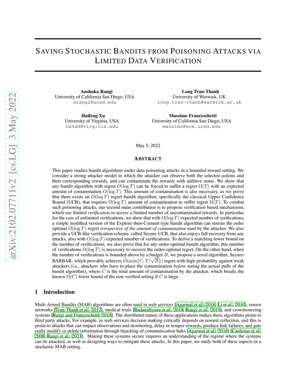 We study bandit algorithms under data poisoning attacks in a bounded reward setting. We consider a strong attacker model in which the attacker can observe both the selected actions and their corresponding rewards and can contaminate the rewards with additive noise. We show that any bandit algorithm with regret can be forced to suffer a regret with an expected amount of contamination . This amount of contamination is also necessary, as we prove that there exists an regret bandit algorithm, specifically the classical UCB, that requires amount of contamination to suffer regret . To combat such attacks, our second main contribution is to propose verification based mechanisms, which use limited verification to access a limited number of uncontaminated rewards. In particular, for the case of unlimited verifications, we show that with expected number of verifications, a simple modified version of the ETC type bandit algorithm can restore the order optimal regret irrespective of the amount of contamination used by the attacker. We also provide a UCB-like verification scheme, called Secure-UCB, that also enjoys full recovery from any attacks, also with expected number of verifications. To derive a matching lower bound on the number of verifications, we prove that for any order-optimal bandit algorithm, this number of verifications is necessary to recover the order-optimal regret. On the other hand, when the number of verifications is bounded above by a budget , we propose a novel algorithm, Secure-BARBAR, which provably achieves regret with high probability against weak attackers where is the total amount of contamination by the attacker, which breaks the known lower bound of the non-verified setting if is large.