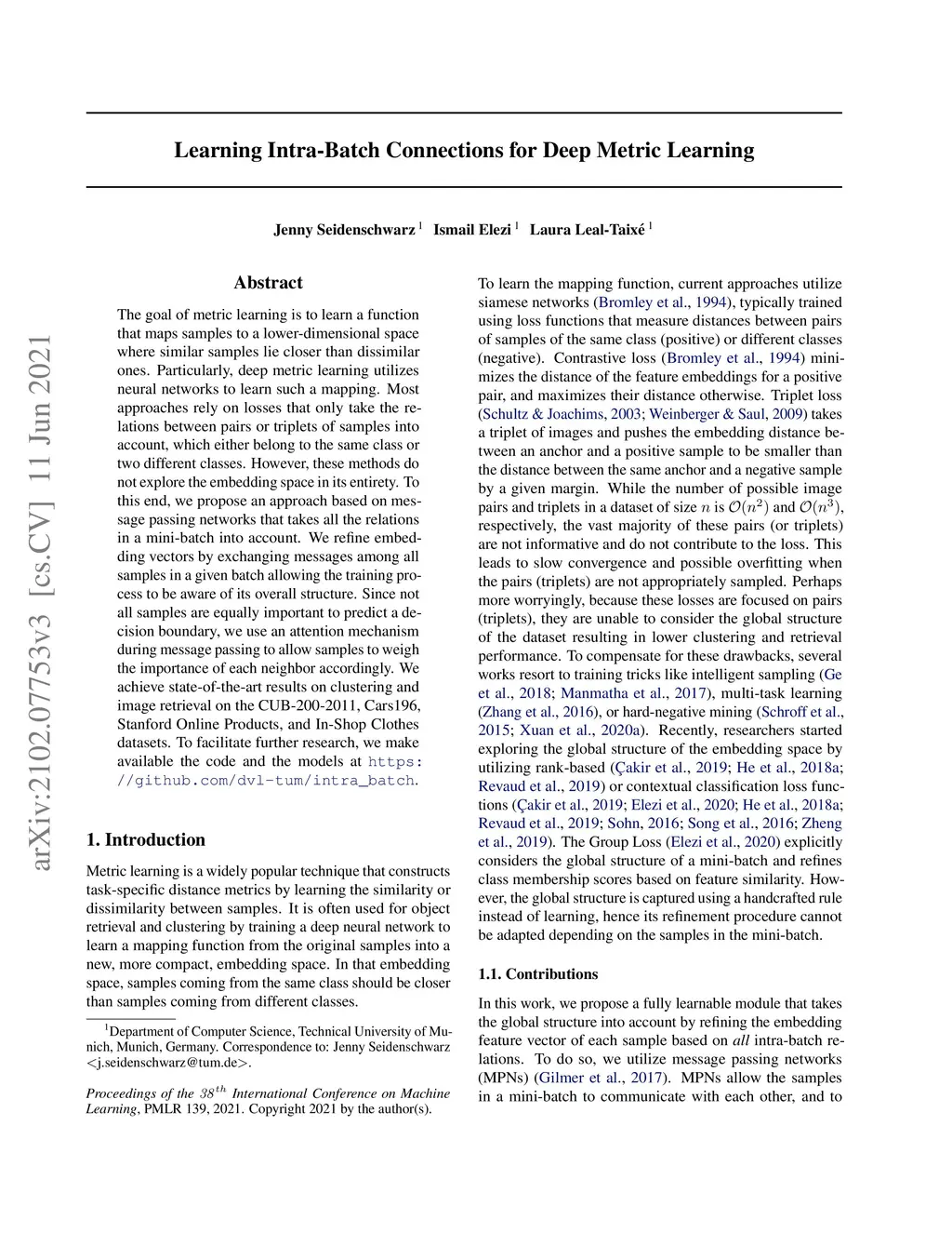 The goal of metric learning is to learn a function that maps samples to a lower-dimensional space where similar samples lie closer than dissimilar ones. In the case of deep metric learning, the mapping is performed by training a neural network. Most approaches rely on losses that only take the relations between pairs or triplets of samples into account, which either belong to the same class or to two different classes. However, these approaches do not explore the embedding space in its entirety. To this end, we propose an approach based on message passing networks that takes into account all the relations in a mini-batch. We refine embedding vectors by exchanging messages among all samples in a given batch allowing the training process to be aware of the overall structure. Since not all samples are equally important to predict a decision boundary, we use dot-product self-attention during message passing to allow samples to weight the importance of each neighbor accordingly. We achieve state-of-the-art results on clustering and image retrieval on the CUB-200-2011, Cars196, Stanford Online Products, and In-Shop Clothes datasets.