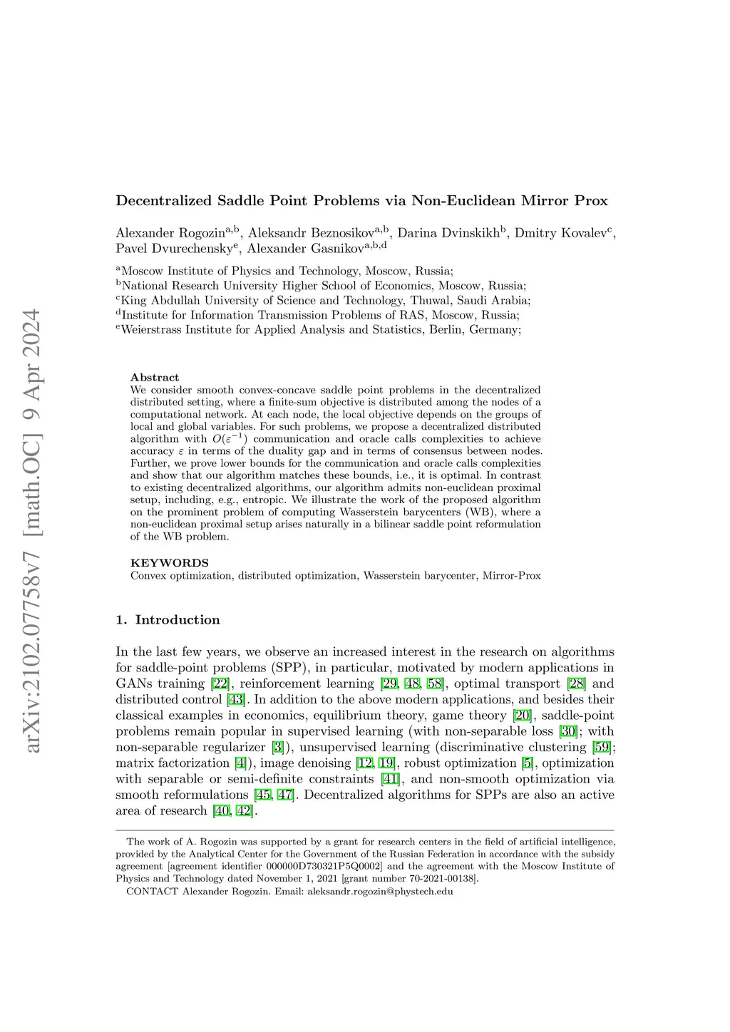 Decentralized Distributed Optimization for Saddle Point Problems