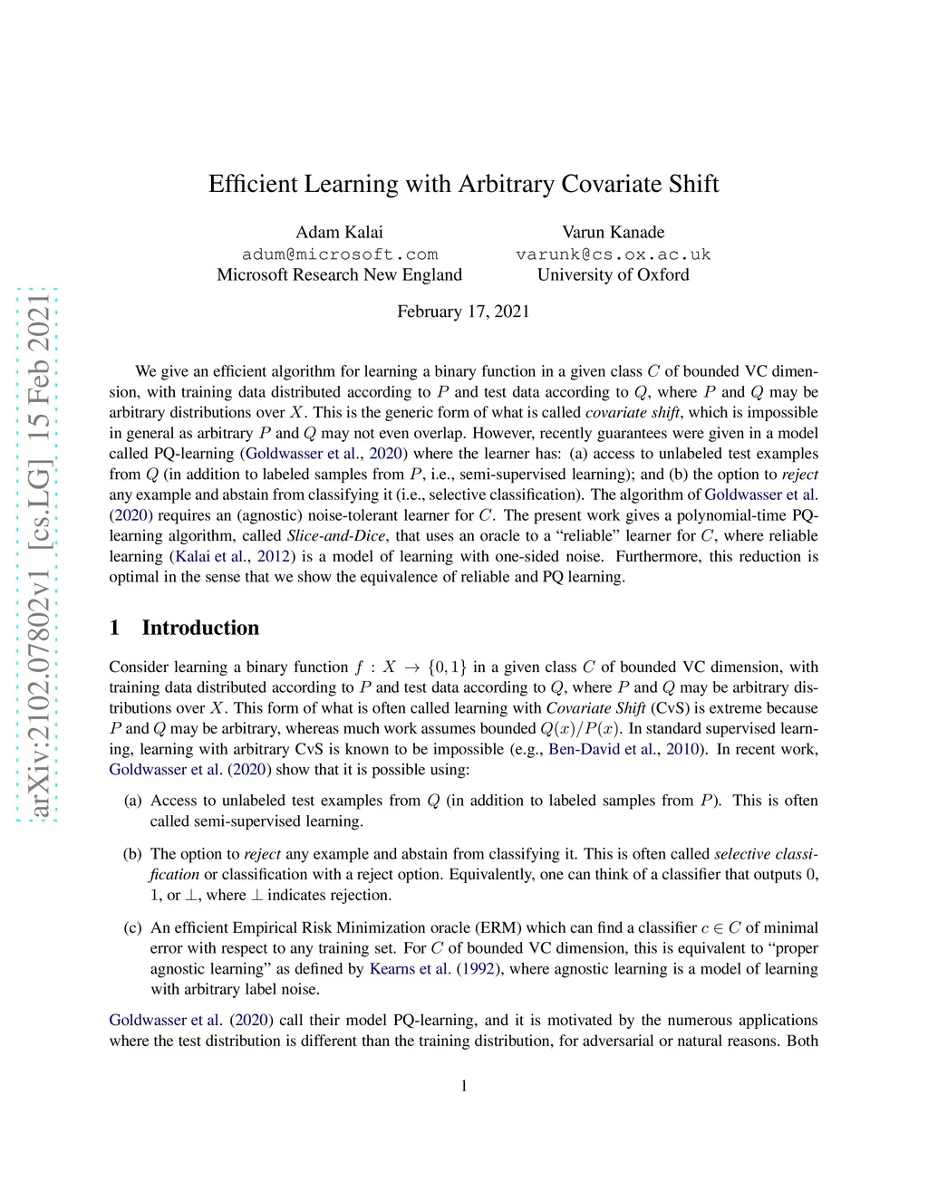 We give an efficient algorithm for learning a binary function in a given class C of bounded VC dimension, with training data distributed according to P and test data according to Q, where P and Q may be arbitrary distributions over X. This is the generic form of what is called covariate shift, which is impossible in general as arbitrary P and Q may not even overlap. However, recently guarantees were given in a model called PQ-learning (Goldwasser et al., 2020) where the learner has: (a) access to unlabeled test examples from Q (in addition to labeled samples from P, i.e., semi-supervised learning); and (b) the option to reject any example and abstain from classifying it (i.e., selective classification). The algorithm of Goldwasser et al. (2020) requires an (agnostic) noise tolerant learner for C. The present work gives a polynomial-time PQ-learning algorithm that uses an oracle to a "reliable" learner for C, where reliable learning (Kalai et al., 2012) is a model of learning with one-sided noise. Furthermore, our reduction is optimal in the sense that we show the equivalence of reliable and PQ learning.