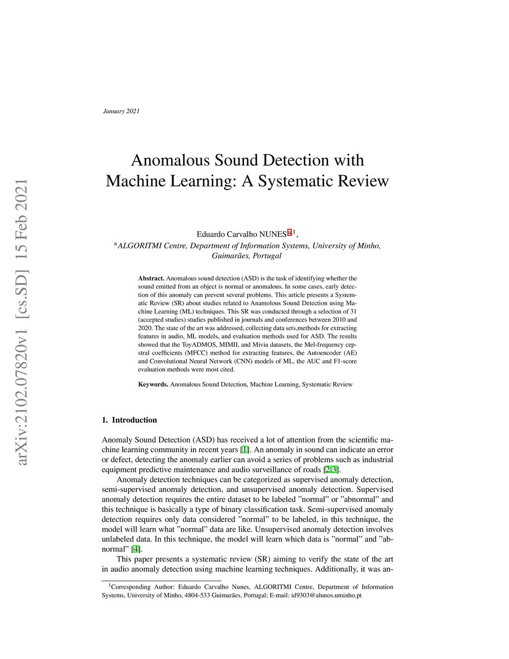 Anomalous sound detection (ASD) is the task of identifying whether the sound emitted from an object is normal or anomalous. In some cases, early detection of this anomaly can prevent several problems. This article presents a Systematic Review (SR) about studies related to Anamolous Sound Detection using Machine Learning (ML) techniques. This SR was conducted through a selection of 31 (accepted studies) studies published in journals and conferences between 2010 and 2020. The state of the art was addressed, collecting data sets, methods for extracting features in audio, ML models, and evaluation methods used for ASD. The results showed that the ToyADMOS, MIMII, and Mivia datasets, the Mel-frequency cepstral coefficients (MFCC) method for extracting features, the Autoencoder (AE) and Convolutional Neural Network (CNN) models of ML, the AUC and F1-score evaluation methods were most cited.