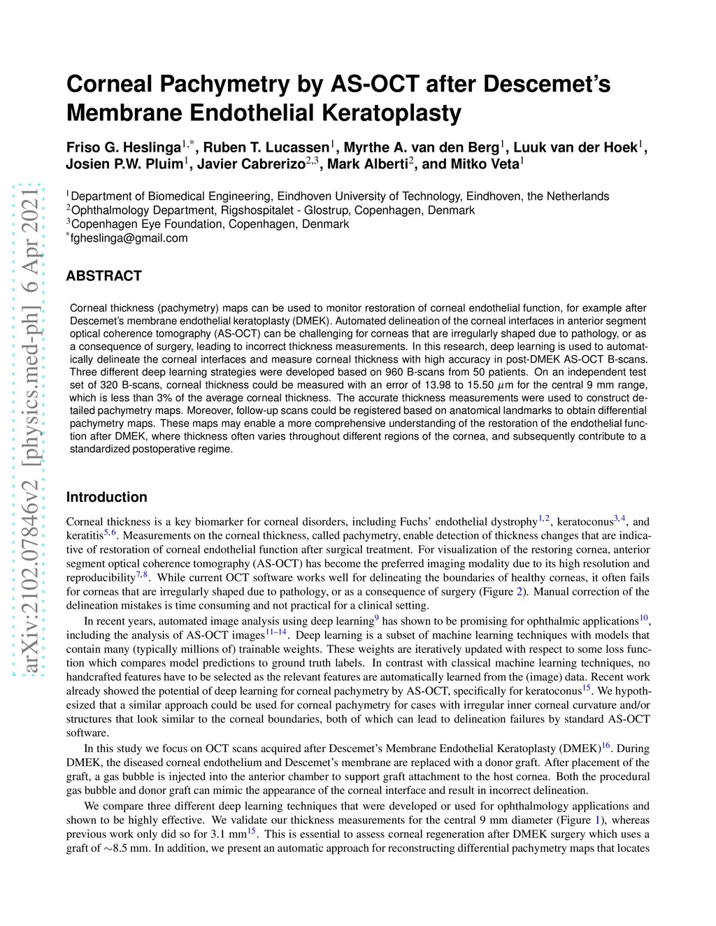 Corneal thickness (pachymetry) maps can be used to monitor restoration of corneal endothelial function, for example after Descemet's membrane endothelial keratoplasty (DMEK). Automated delineation of the corneal interfaces in anterior segment optical coherence tomography (AS-OCT) can be challenging for corneas that are irregularly shaped due to pathology, or as a consequence of surgery, leading to incorrect thickness measurements. In this research, deep learning is used to automatically delineate the corneal interfaces and measure corneal thickness with high accuracy in post-DMEK AS-OCT B-scans. Three different deep learning strategies were developed based on 960 B-scans from 50 patients. On an independent test set of 320 B-scans, corneal thickness could be measured with an error of 13.98 to 15.50 micrometer for the central 9 mm range, which is less than 3% of the average corneal thickness. The accurate thickness measurements were used to construct detailed pachymetry maps. Moreover, follow-up scans could be registered based on anatomical landmarks to obtain differential pachymetry maps. These maps may enable a more comprehensive understanding of the restoration of the endothelial function after DMEK, where thickness often varies throughout different regions of the cornea, and subsequently contribute to a standardized postoperative regime.