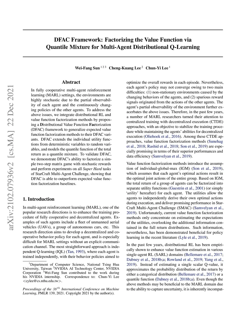 In fully cooperative multi-agent reinforcement learning (MARL) settings, the environments are highly stochastic due to the partial observability of each agent and the continuously changing policies of the other agents. To address the above issues, we integrate distributional RL and value function factorization methods by proposing a Distributional Value Function Factorization (DFAC) framework to generalize expected value function factorization methods to their DFAC variants. DFAC extends the individual utility functions from deterministic variables to random variables, and models the quantile function of the total return as a quantile mixture. To validate DFAC, we demonstrate DFAC's ability to factorize a simple two-step matrix game with stochastic rewards and perform experiments on all Super Hard tasks of StarCraft Multi-Agent Challenge, showing that DFAC is able to outperform expected value function factorization baselines.