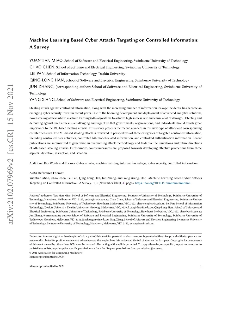 Stealing attack against controlled information, along with the increasing number of information leakage incidents, has become an emerging cyber security threat in recent years. Due to the booming development and deployment of advanced analytics solutions, novel stealing attacks utilize machine learning (ML) algorithms to achieve high success rate and cause a lot of damage. Detecting and defending against such attacks is challenging and urgent so that governments, organizations, and individuals should attach great importance to the ML-based stealing attacks. This survey presents the recent advances in this new type of attack and corresponding countermeasures. The ML-based stealing attack is reviewed in perspectives of three categories of targeted controlled information, including controlled user activities, controlled ML model-related information, and controlled authentication information. Recent publications are summarized to generalize an overarching attack methodology and to derive the limitations and future directions of ML-based stealing attacks. Furthermore, countermeasures are proposed towards developing effective protections from three aspects -- detection, disruption, and isolation.