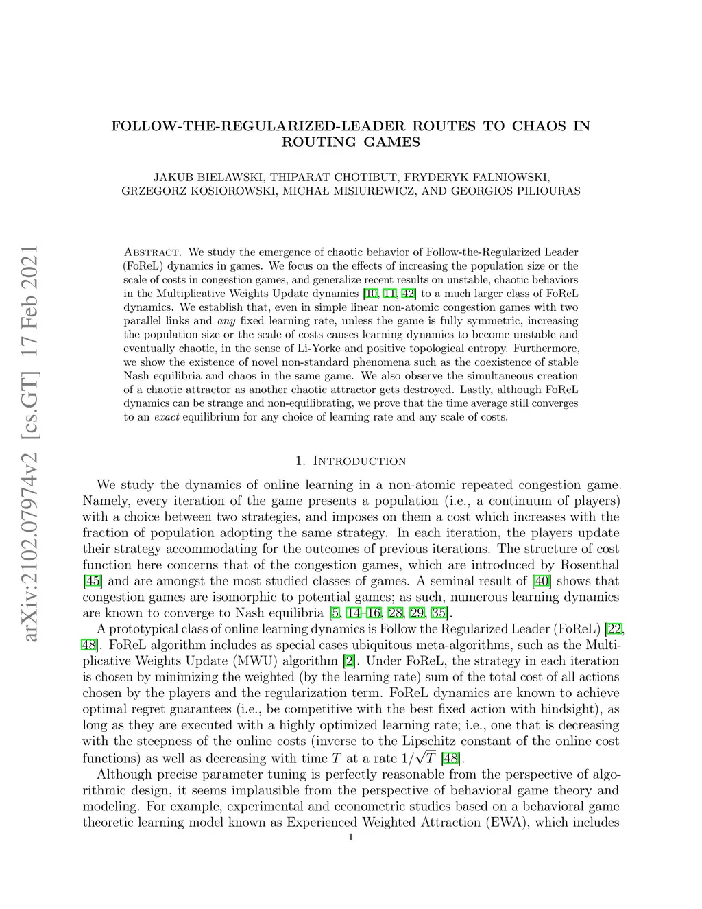 We study the emergence of chaotic behavior of Follow-the-Regularized Leader (FoReL) dynamics in games. We focus on the effects of increasing the population size or the scale of costs in congestion games, and generalize recent results on unstable, chaotic behaviors in the Multiplicative Weights Update dynamics to a much larger class of FoReL dynamics. We establish that, even in simple linear non-atomic congestion games with two parallel links and any fixed learning rate, unless the game is fully symmetric, increasing the population size or the scale of costs causes learning dynamics to become unstable and eventually chaotic, in the sense of Li-Yorke and positive topological entropy. Furthermore, we show the existence of novel non-standard phenomena such as the coexistence of stable Nash equilibria and chaos in the same game. We also observe the simultaneous creation of a chaotic attractor as another chaotic attractor gets destroyed. Lastly, although FoReL dynamics can be strange and non-equilibrating, we prove that the time average still converges to an exact equilibrium for any choice of learning rate and any scale of costs.