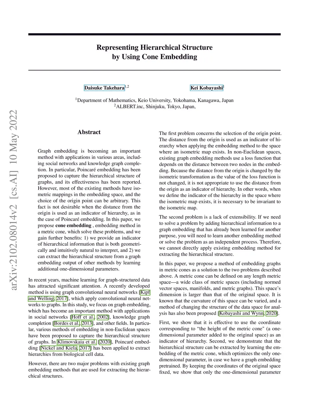 Representing Hierarchical Structure by Using Cone Embedding