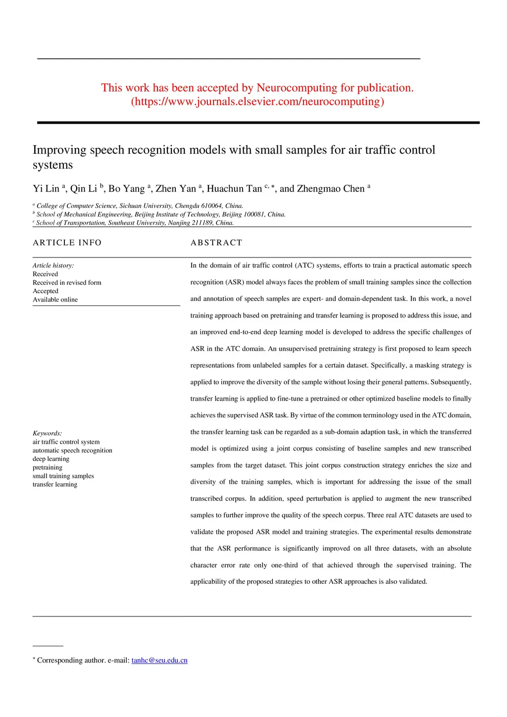 In the domain of air traffic control (ATC) systems, efforts to train a practical automatic speech recognition (ASR) model always faces the problem of small training samples since the collection and annotation of speech samples are expert- and domain-dependent task. In this work, a novel training approach based on pretraining and transfer learning is proposed to address this issue, and an improved end-to-end deep learning model is developed to address the specific challenges of ASR in the ATC domain. An unsupervised pretraining strategy is first proposed to learn speech representations from unlabeled samples for a certain dataset. Specifically, a masking strategy is applied to improve the diversity of the sample without losing their general patterns. Subsequently, transfer learning is applied to fine-tune a pretrained or other optimized baseline models to finally achieves the supervised ASR task. By virtue of the common terminology used in the ATC domain, the transfer learning task can be regarded as a sub-domain adaption task, in which the transferred model is optimized using a joint corpus consisting of baseline samples and new transcribed samples from the target dataset. This joint corpus construction strategy enriches the size and diversity of the training samples, which is important for addressing the issue of the small transcribed corpus. In addition, speed perturbation is applied to augment the new transcribed samples to further improve the quality of the speech corpus. Three real ATC datasets are used to validate the proposed ASR model and training strategies. The experimental results demonstrate that the ASR performance is significantly improved on all three datasets, with an absolute character error rate only one-third of that achieved through the supervised training. The applicability of the proposed strategies to other ASR approaches is also validated.