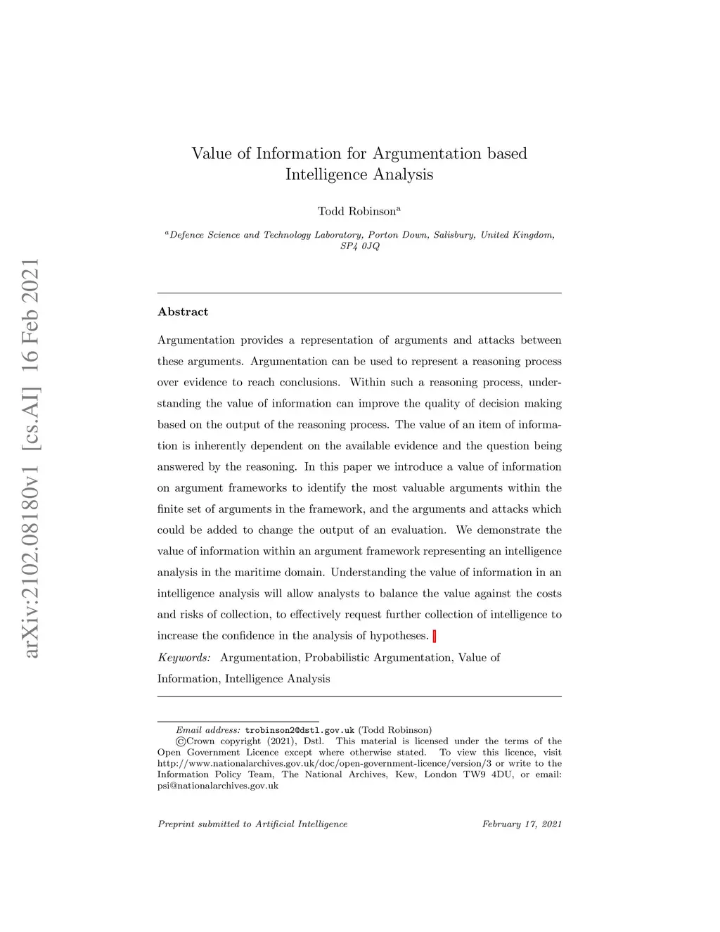 Argumentation provides a representation of arguments and attacks between these arguments. Argumentation can be used to represent a reasoning process over evidence to reach conclusions. Within such a reasoning process, understanding the value of information can improve the quality of decision making based on the output of the reasoning process. The value of an item of information is inherently dependent on the available evidence and the question being answered by the reasoning. In this paper we introduce a value of information on argument frameworks to identify the most valuable arguments within the finite set of arguments in the framework, and the arguments and attacks which could be added to change the output of an evaluation. We demonstrate the value of information within an argument framework representing an intelligence analysis in the maritime domain. Understanding the value of information in an intelligence analysis will allow analysts to balance the value against the costs and risks of collection, to effectively request further collection of intelligence to increase the confidence in the analysis of hypotheses.