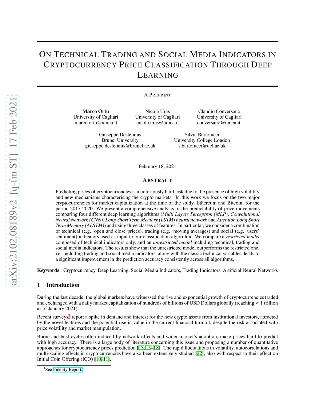 This work aims to analyse the predictability of price movements of cryptocurrencies on both hourly and daily data observed from January 2017 to January 2021, using deep learning algorithms. For our experiments, we used three sets of features: technical, trading and social media indicators, considering a restricted model of only technical indicators and an unrestricted model with technical, trading and social media indicators. We verified whether the consideration of trading and social media indicators, along with the classic technical variables (such as price's returns), leads to a significative improvement in the prediction of cryptocurrencies price's changes. We conducted the study on the two highest cryptocurrencies in volume and value (at the time of the study): Bitcoin and Ethereum. We implemented four different machine learning algorithms typically used in time-series classification problems: Multi Layers Perceptron (MLP), Convolutional Neural Network (CNN), Long Short Term Memory (LSTM) neural network and Attention Long Short Term Memory (ALSTM). We devised the experiments using the advanced bootstrap technique to consider the variance problem on test samples, which allowed us to evaluate a more reliable estimate of the model's performance. Furthermore, the Grid Search technique was used to find the best hyperparameters values for each implemented algorithm. The study shows that, based on the hourly frequency results, the unrestricted model outperforms the restricted one. The addition of the trading indicators to the classic technical indicators improves the accuracy of Bitcoin and Ethereum price's changes prediction, with an increase of accuracy from a range of 51-55% for the restricted model, to 67-84% for the unrestricted model.