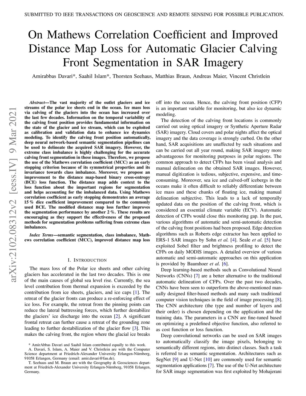 The vast majority of the outlet glaciers and ice streams of the polar ice sheets end in the ocean. Ice mass loss via calving of the glaciers into the ocean has increased over the last few decades. Information on the temporal variability of the calving front position provides fundamental information on the state of the glacier and ice stream, which can be exploited as calibration and validation data to enhance ice dynamics modeling. To identify the calving front position automatically, deep neural network-based semantic segmentation pipelines can be used to delineate the acquired SAR imagery. However, the extreme class imbalance is highly challenging for the accurate calving front segmentation in these images. Therefore, we propose the use of the Mathews correlation coefficient (MCC) as an early stopping criterion because of its symmetrical properties and its invariance towards class imbalance. Moreover, we propose an improvement to the distance map-based binary cross-entropy (BCE) loss function. The distance map adds context to the loss function about the important regions for segmentation and helps accounting for the imbalanced data. Using Mathews correlation coefficient as early stopping demonstrates an average 15% dice coefficient improvement compared to the commonly used BCE. The modified distance map loss further improves the segmentation performance by another 2%. These results are encouraging as they support the effectiveness of the proposed methods for segmentation problems suffering from extreme class imbalances.