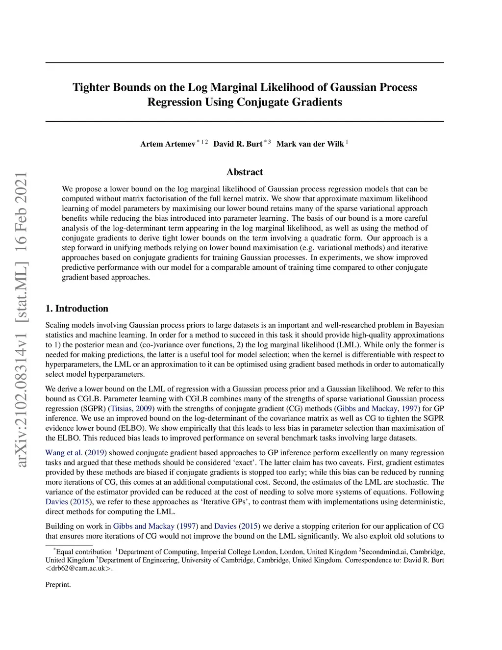 We propose a lower bound on the log marginal likelihood of Gaussian process regression models that can be computed without matrix factorisation of the full kernel matrix. We show that approximate maximum likelihood learning of model parameters by maximising our lower bound retains many of the sparse variational approach benefits while reducing the bias introduced into parameter learning. The basis of our bound is a more careful analysis of the log-determinant term appearing in the log marginal likelihood, as well as using the method of conjugate gradients to derive tight lower bounds on the term involving a quadratic form. Our approach is a step forward in unifying methods relying on lower bound maximisation (e.g. variational methods) and iterative approaches based on conjugate gradients for training Gaussian processes. In experiments, we show improved predictive performance with our model for a comparable amount of training time compared to other conjugate gradient based approaches.