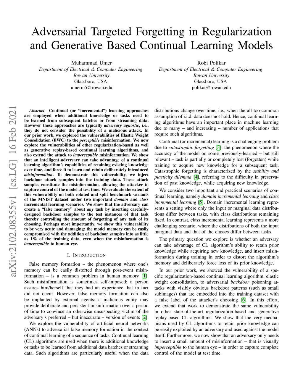 Continual (or "incremental") learning approaches are employed when additional knowledge or tasks need to be learned from subsequent batches or from streaming data. However these approaches are typically adversary agnostic, i.e., they do not consider the possibility of a malicious attack. In our prior work, we explored the vulnerabilities of Elastic Weight Consolidation (EWC) to the perceptible misinformation. We now explore the vulnerabilities of other regularization-based as well as generative replay-based continual learning algorithms, and also extend the attack to imperceptible misinformation. We show that an intelligent adversary can take advantage of a continual learning algorithm's capabilities of retaining existing knowledge over time, and force it to learn and retain deliberately introduced misinformation. To demonstrate this vulnerability, we inject backdoor attack samples into the training data. These attack samples constitute the misinformation, allowing the attacker to capture control of the model at test time. We evaluate the extent of this vulnerability on both rotated and split benchmark variants of the MNIST dataset under two important domain and class incremental learning scenarios. We show that the adversary can create a "false memory" about any task by inserting carefully-designed backdoor samples to the test instances of that task thereby controlling the amount of forgetting of any task of its choosing. Perhaps most importantly, we show this vulnerability to be very acute and damaging: the model memory can be easily compromised with the addition of backdoor samples into as little as 1\% of the training data, even when the misinformation is imperceptible to human eye.