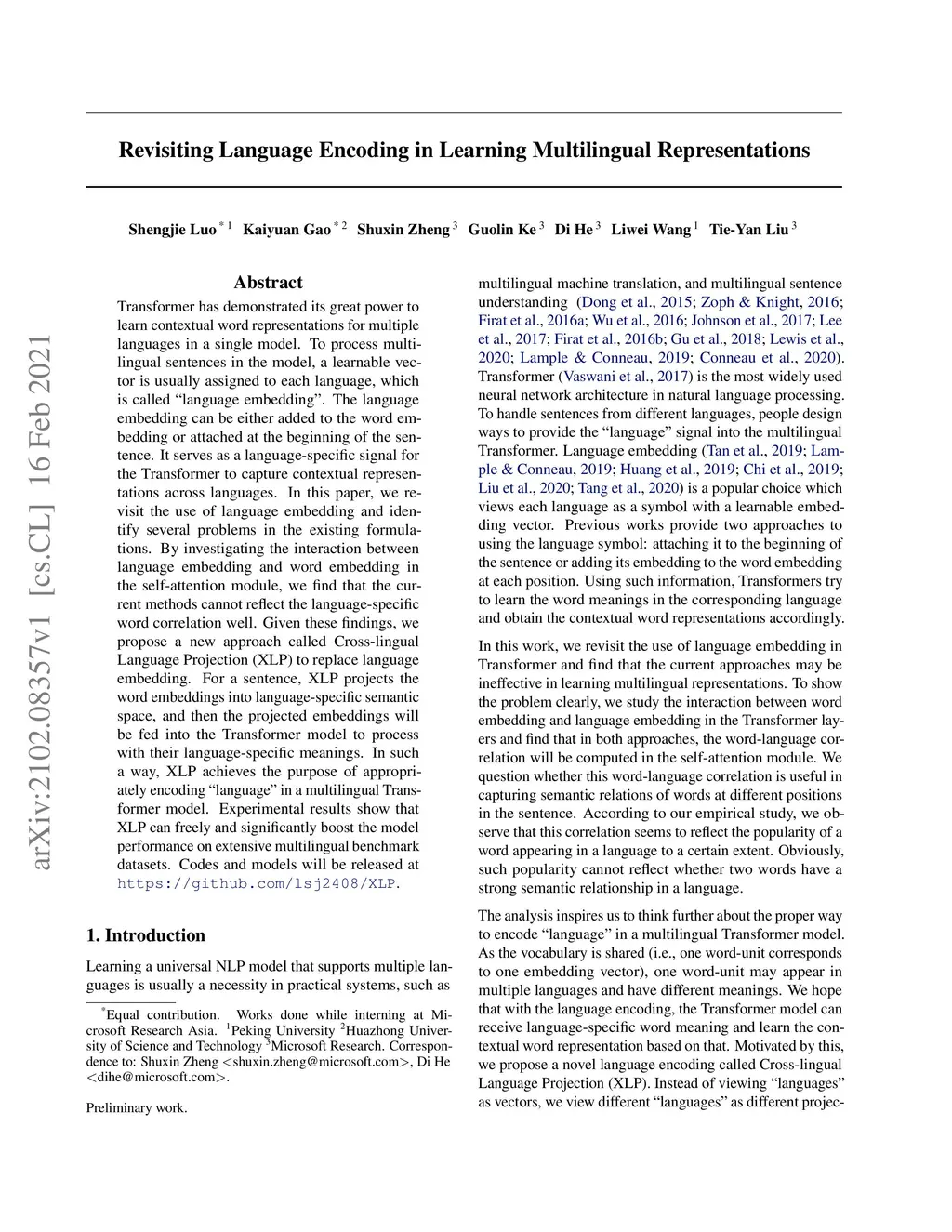 Transformer has demonstrated its great power to learn contextual word representations for multiple languages in a single model. To process multilingual sentences in the model, a learnable vector is usually assigned to each language, which is called "language embedding". The language embedding can be either added to the word embedding or attached at the beginning of the sentence. It serves as a language-specific signal for the Transformer to capture contextual representations across languages. In this paper, we revisit the use of language embedding and identify several problems in the existing formulations. By investigating the interaction between language embedding and word embedding in the self-attention module, we find that the current methods cannot reflect the language-specific word correlation well. Given these findings, we propose a new approach called Cross-lingual Language Projection (XLP) to replace language embedding. For a sentence, XLP projects the word embeddings into language-specific semantic space, and then the projected embeddings will be fed into the Transformer model to process with their language-specific meanings. In such a way, XLP achieves the purpose of appropriately encoding "language" in a multilingual Transformer model. Experimental results show that XLP can freely and significantly boost the model performance on extensive multilingual benchmark datasets. Codes and models will be released at https://github.com/lsj2408/XLP.