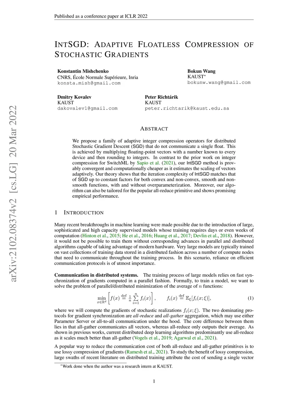 IntSGD: Adaptive Floatless Compression of Stochastic Gradients