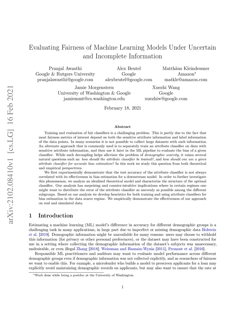 Training and evaluation of fair classifiers is a challenging problem. This is partly due to the fact that most fairness metrics of interest depend on both the sensitive attribute information and label information of the data points. In many scenarios it is not possible to collect large datasets with such information. An alternate approach that is commonly used is to separately train an attribute classifier on data with sensitive attribute information, and then use it later in the ML pipeline to evaluate the bias of a given classifier. While such decoupling helps alleviate the problem of demographic scarcity, it raises several natural questions such as: how should the attribute classifier be trained?, and how should one use a given attribute classifier for accurate bias estimation? In this work we study this question from both theoretical and empirical perspectives. We first experimentally demonstrate that the test accuracy of the attribute classifier is not always correlated with its effectiveness in bias estimation for a downstream model. In order to further investigate this phenomenon, we analyze an idealized theoretical model and characterize the structure of the optimal classifier. Our analysis has surprising and counter-intuitive implications where in certain regimes one might want to distribute the error of the attribute classifier as unevenly as possible among the different subgroups. Based on our analysis we develop heuristics for both training and using attribute classifiers for bias estimation in the data scarce regime. We empirically demonstrate the effectiveness of our approach on real and simulated data.