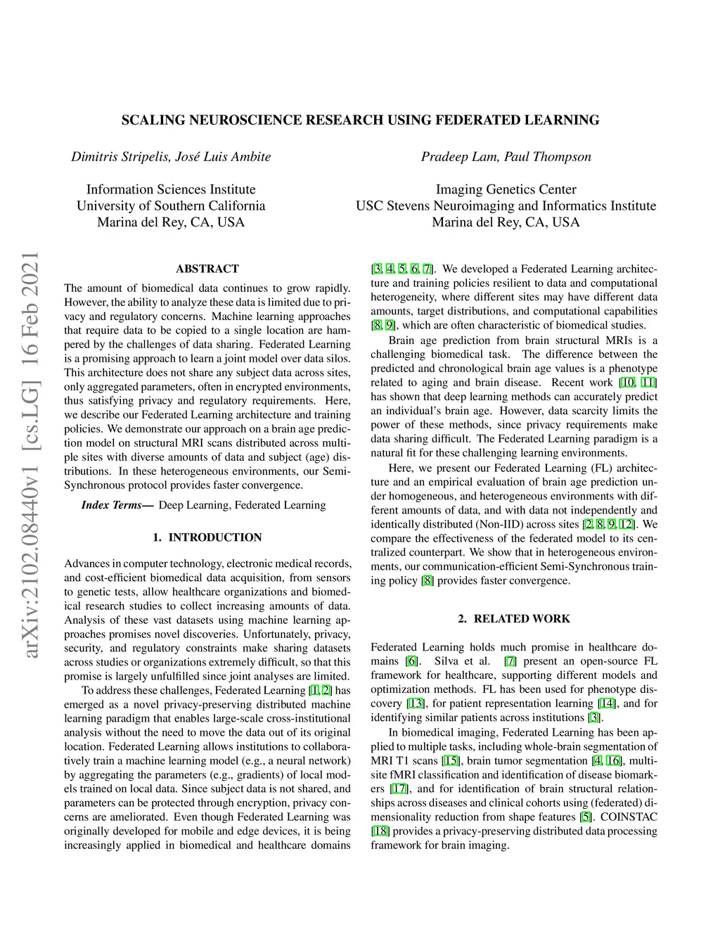 The amount of biomedical data continues to grow rapidly. However, the ability to analyze these data is limited due to privacy and regulatory concerns. Machine learning approaches that require data to be copied to a single location are hampered by the challenges of data sharing. Federated Learning is a promising approach to learn a joint model over data silos. This architecture does not share any subject data across sites, only aggregated parameters, often in encrypted environments, thus satisfying privacy and regulatory requirements. Here, we describe our Federated Learning architecture and training policies. We demonstrate our approach on a brain age prediction model on structural MRI scans distributed across multiple sites with diverse amounts of data and subject (age) distributions. In these heterogeneous environments, our Semi-Synchronous protocol provides faster convergence.